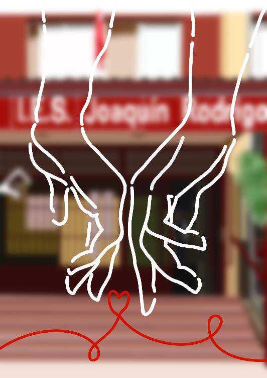 Bachilleratoy3ºESO,respectivamentesalen fuera del perímetro del instituto, los primeros en busca de un banco libre en el que sentarse y los segundos se alejan algo másdelcentro,mientrasqueEySsedirigen a la cafetería. A los seis el recreo se les pasa volando, entre miradas cómplices, conversaciones emotivas y algún que otro beso.