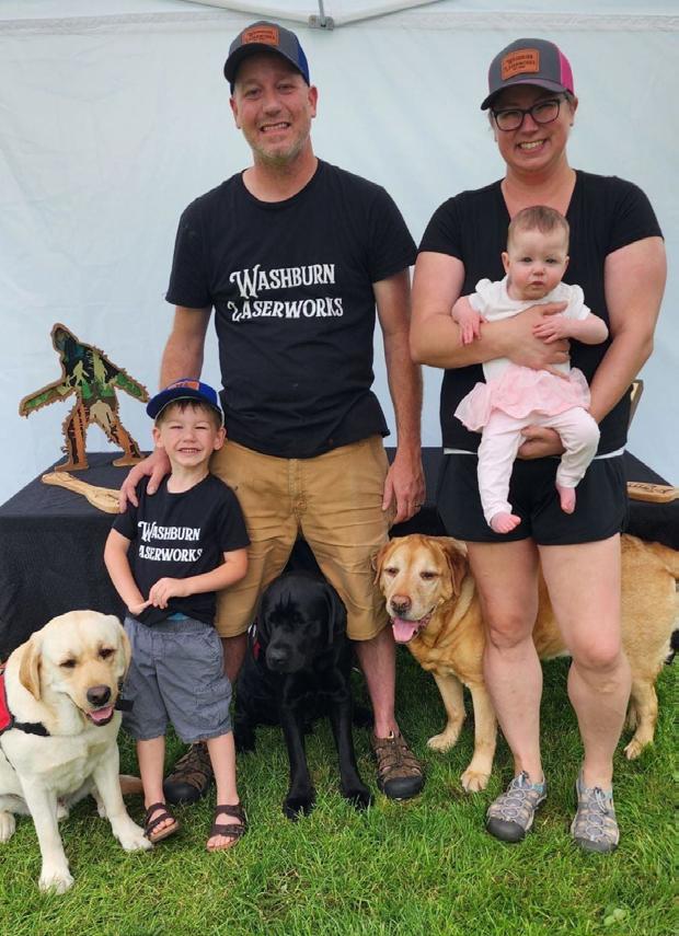 them into Washburn Laserworks. Bob frequently takes the dogs to shows where he showcases his laser-cut products. This helps socialize the dogs and raises awareness and funds for the charity. Additionally, a portion of the profits from specific products, such as military-themed hats and custom 3D ornaments, goes directly to supporting the training program.