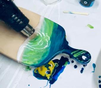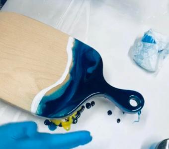 In order to prevent the resin from sticking to the back/bottom of your project, cover the back of your board in Paste wax. Position your table risers to elevate the board off the table, it is imperative that you ensure your board is level prior to beginning your design. If you do not have table risers, disposable mixing cups are a great alternative. Grab your mask and gloves, and let’s get started!