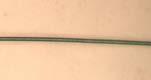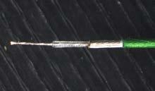 Trifilar wire <52 AWG with stripped insulation for soldering.