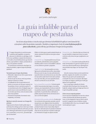 l mapeo de pestañas es una técnica para planificar qué longitudes, curvaturas y grosores se utilizarán en cada lugar, con el fin de crear un fabuloso conjunto de extensiones con el estilo y el nivel de dramatismo que desea la clienta, y que también se adapte a la forma de sus ojos y a sus pestañas naturales. Te mostraremos exactamente cómo hacer un mapa de pestañas, y algunos mapas de pestañas populares. Necesitarás para el mapeo de pestañas: • Delineador o lápiz de ojos. Esto es para marcar primero en la piel. • Parches de gel. Se colocan sobre las pestañas inferiores mientras se trabaja. • Un bolígrafo de color. Es para marcar en el parche; es necesario un color que contraste con las pestañas; el rojo es una buena opción. Te recomendamos que evites el bolígrafo negro, ya que las marcas serán más difíciles de ver, pero si es lo único que tienes, coloca las marcas más lejos de las pestañas. • Extensiones de pestañas. Necesitarás varias longitudes y curvaturas. Qué hacer antes de comenzar con el mapeo de pestañas Seguramente la clienta te habrá pedido algo en particular. Sin embargo, primero tienes que evaluar una serie de aspectos diferentes del rostro y los ojos de tu cliente para determinar si lo que te ha pedido le va a sentar bien, y si no es así... ¡encuentra algo que sí le funcione!