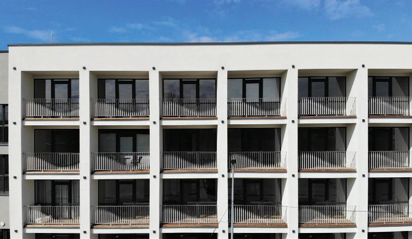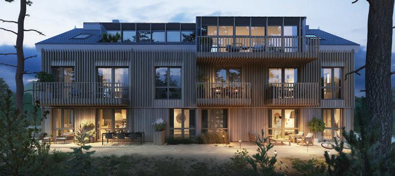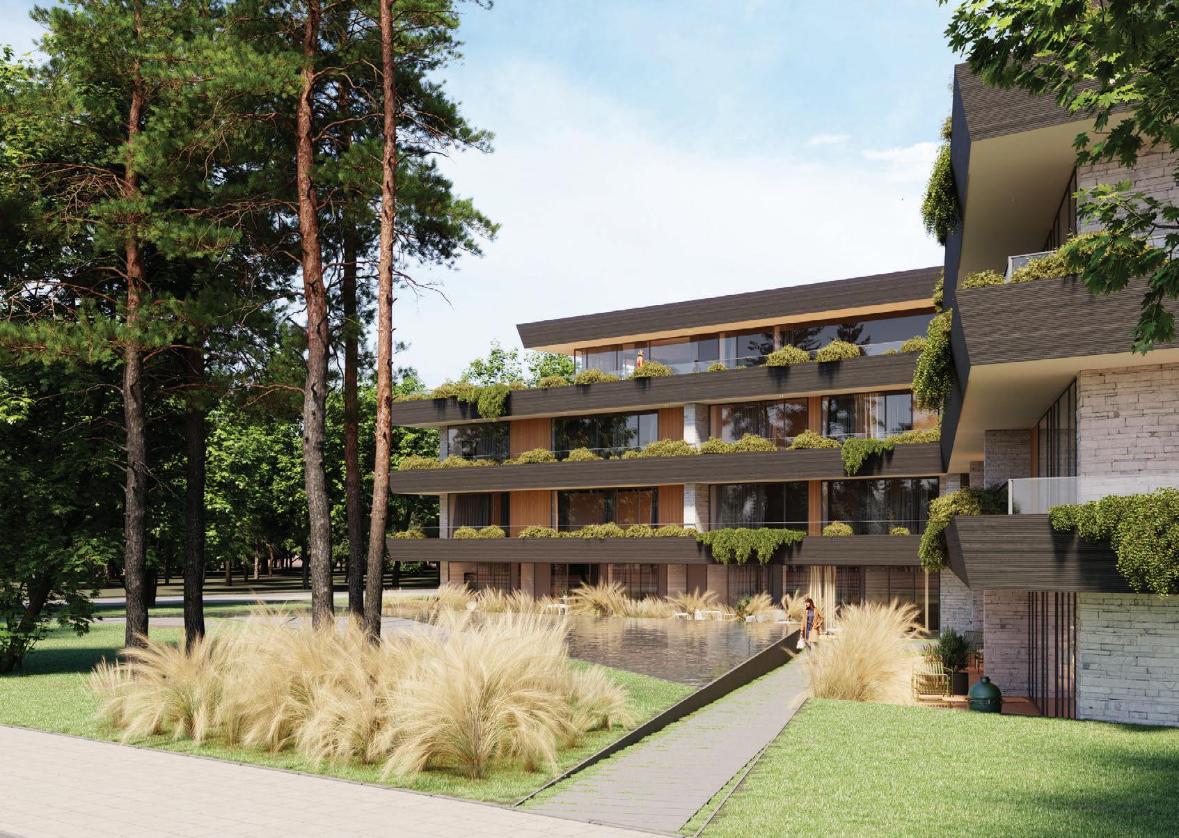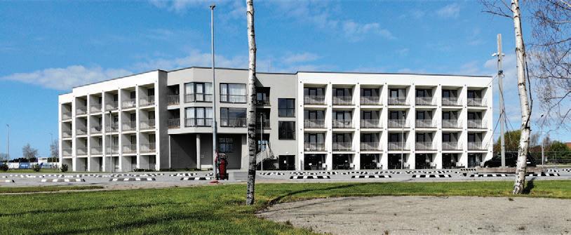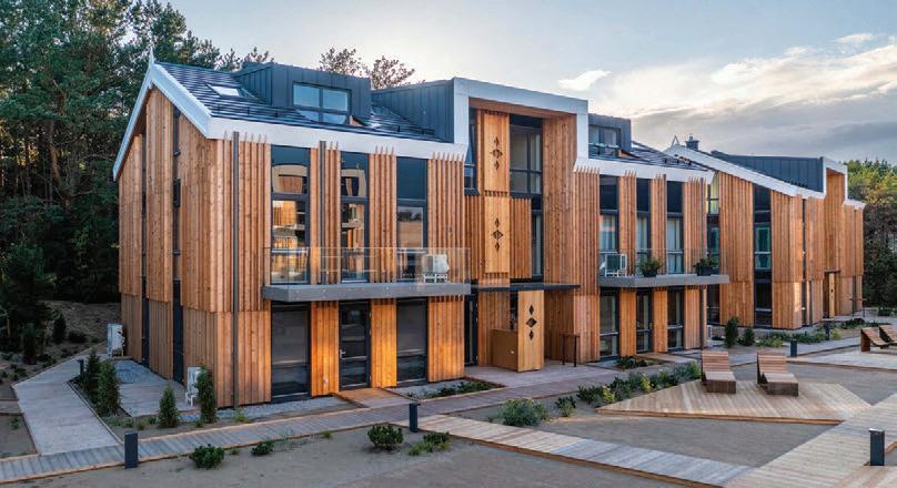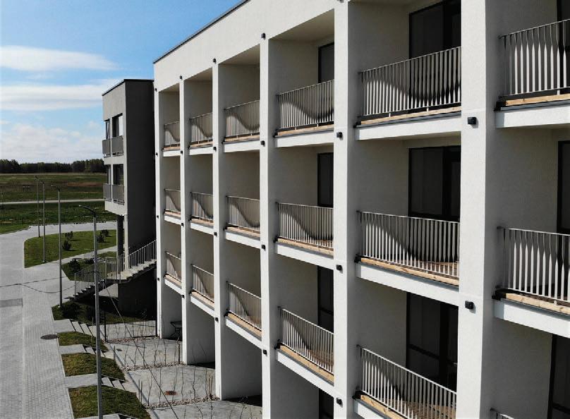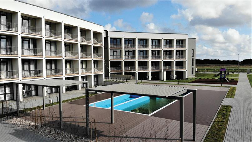The project is a reconstruction of an unfinished building star ted in 1985. The interior of the building was remodelled while keeping the original corridor system. All holiday apar tments have balconies with metal railings decorated with a swirling wave motif. The façade of the building is a plastered thermal insulation system. Residents can enjoy a recreation area with an outdoor pool or an active area with playgrounds and fitness areas.