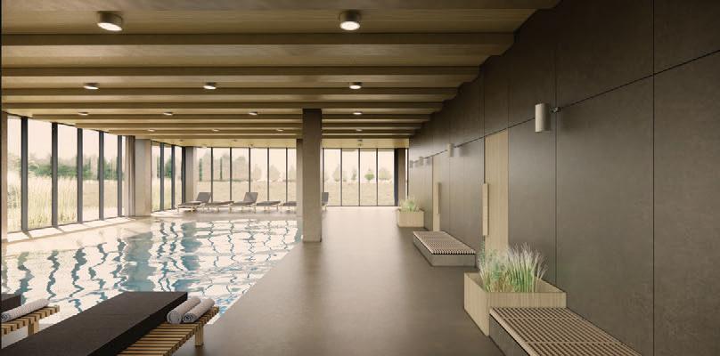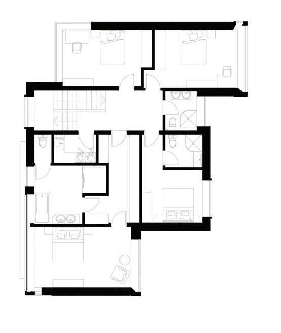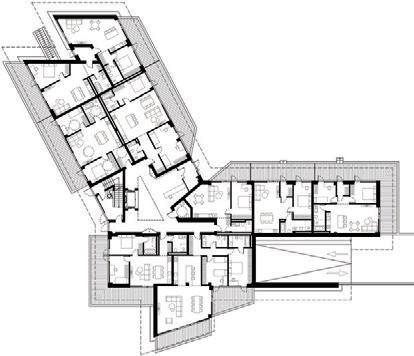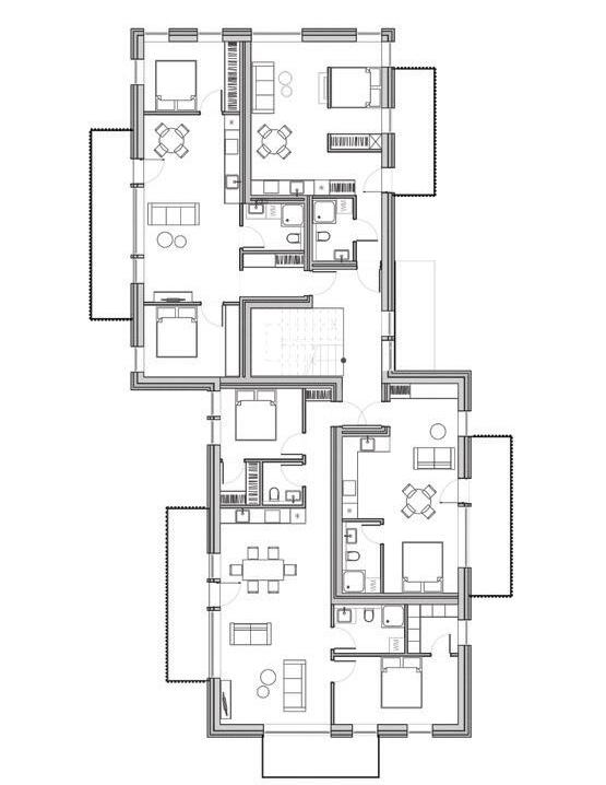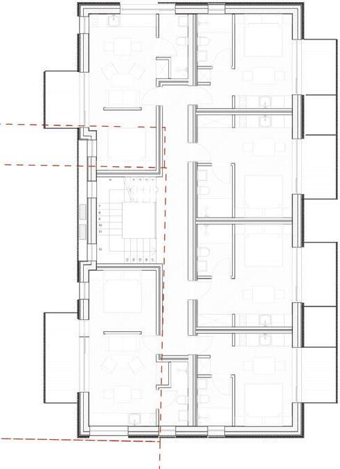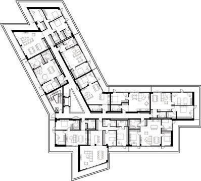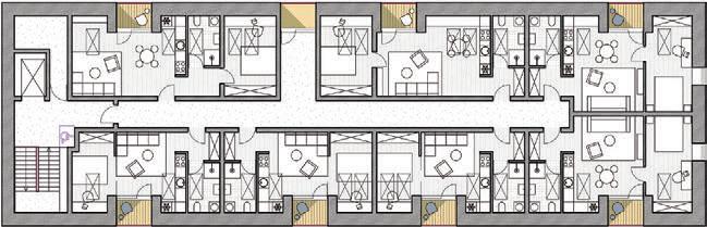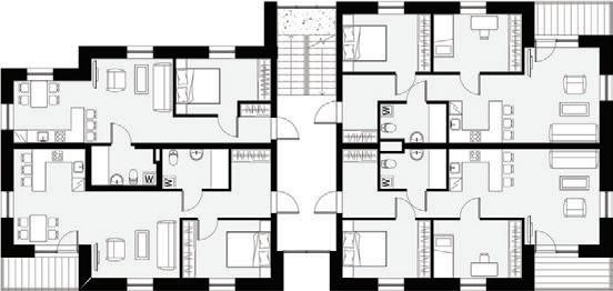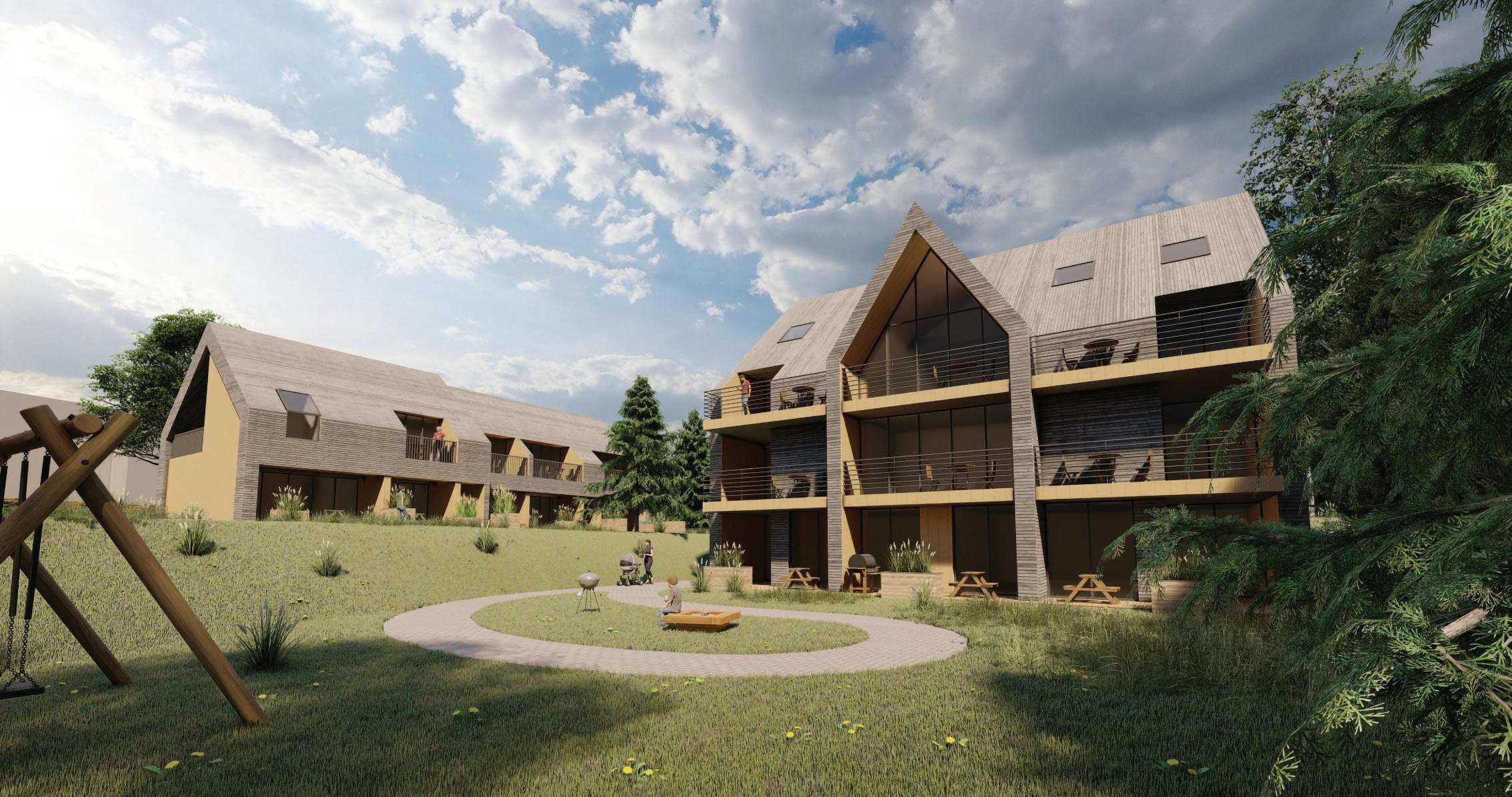 The project is a reconstruction of an unfinished building star ted in 1985. The interior of the building was remodelled while keeping the original corridor system. All holiday apar tments have balconies with metal railings decorated with a swirling wave motif. The façade of the building is a plastered thermal insulation system. Residents can enjoy a recreation area with an outdoor pool or an active area with playgrounds and fitness areas.
