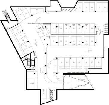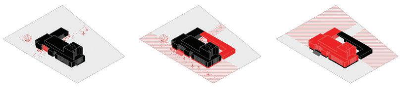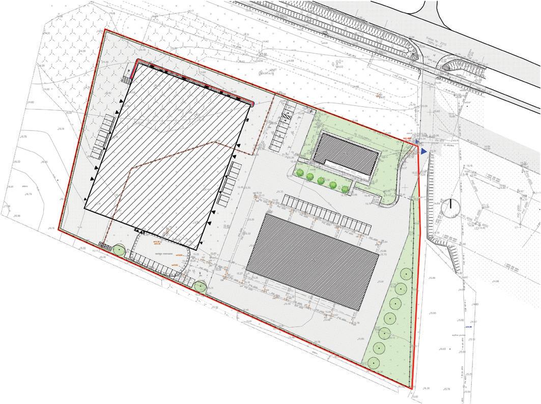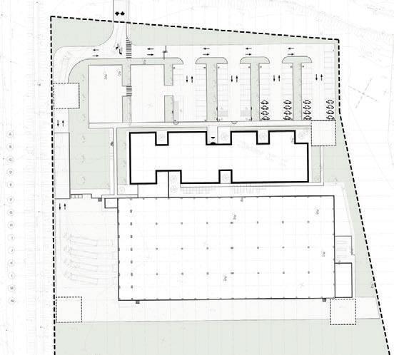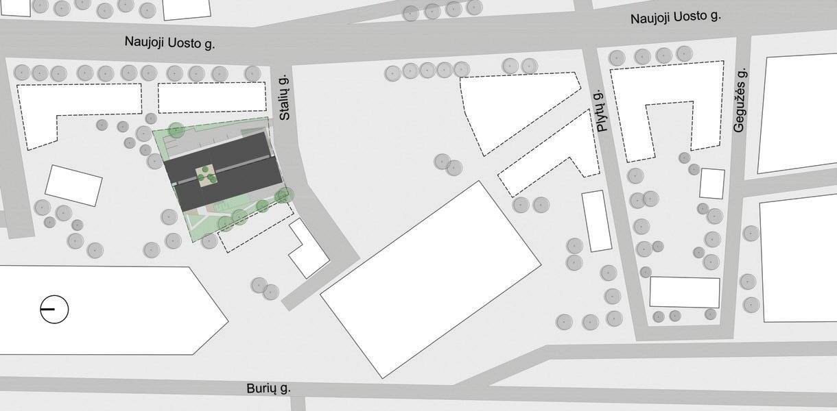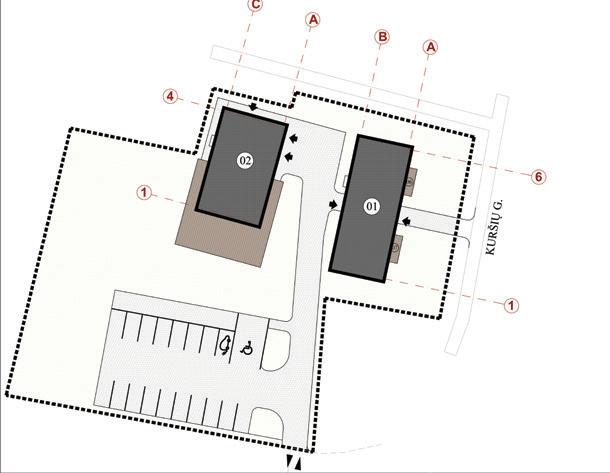 The buildings are designed as rectangular shapes, consisting of different height and size volumes – a three-storey volume along Taikos and Jūrininkų street corner and a single storey volume at the back together forming a semi closed courtyard. The main volume is composed of two volumes forming a corner with clear and straight forms with facades oriented to the axes of the streets. The volumes are simple and straightforward, driven by the plot's flat rectangular layout and project requirements. These functionally interconnected par ts buildings serve various commercial and administrative purposes, including trade, administration, and storage activities.