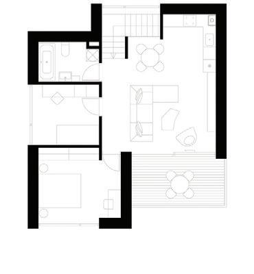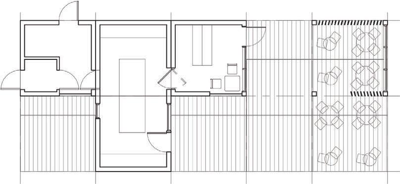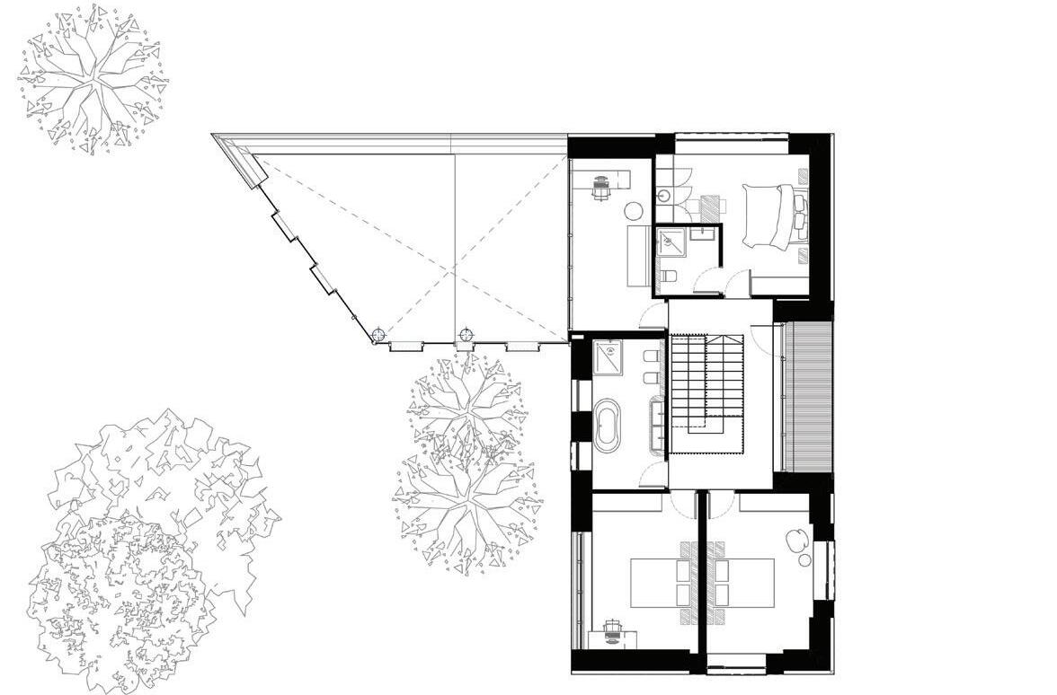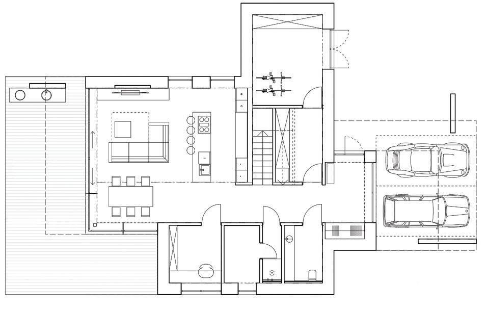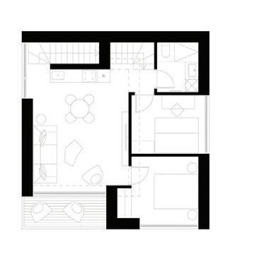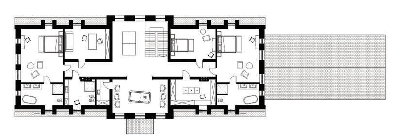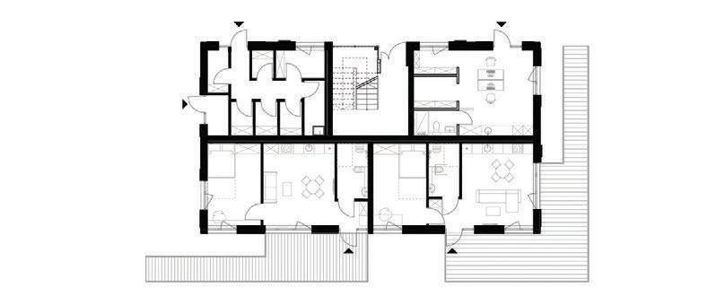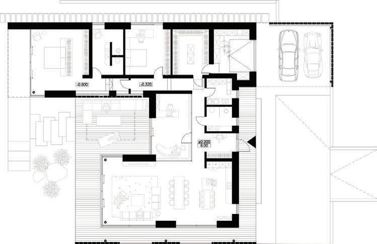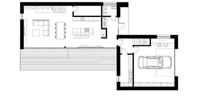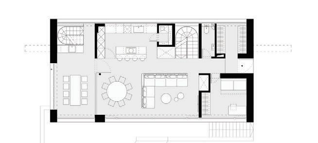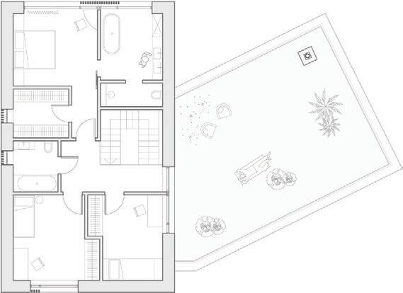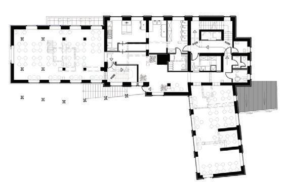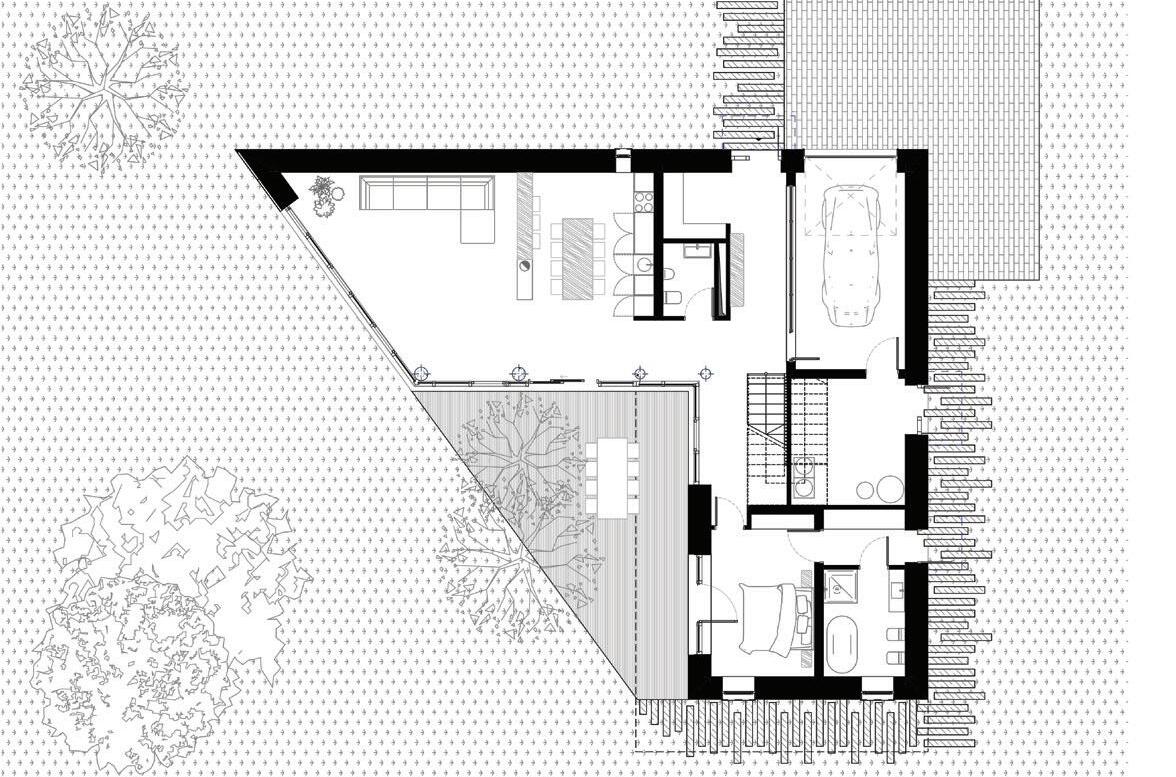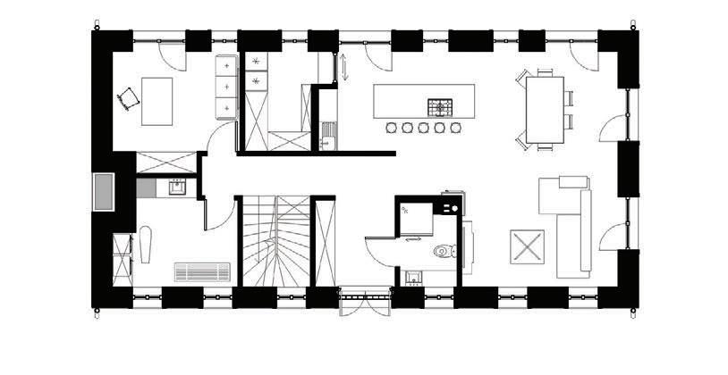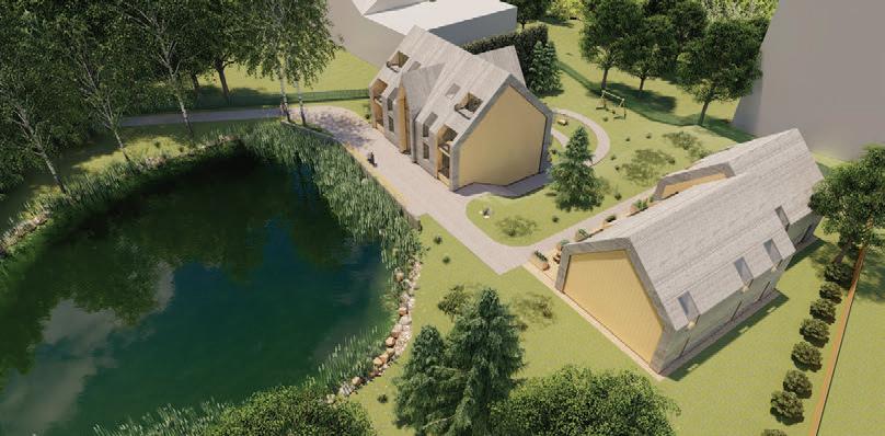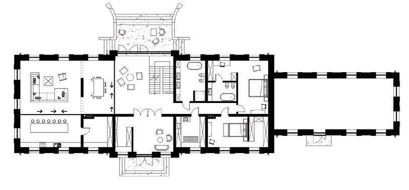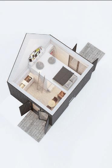 This is a unique project that hides intriguing stories. It is likely one of the first structures in Lithuania that utilised the old Japanese Shou Sugi Ban wood processing technique. When the sur face of the wood is burned, it becomes charcoal-like and protects the structure from external environmental factors.