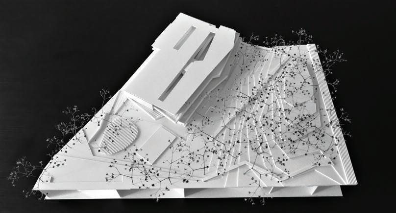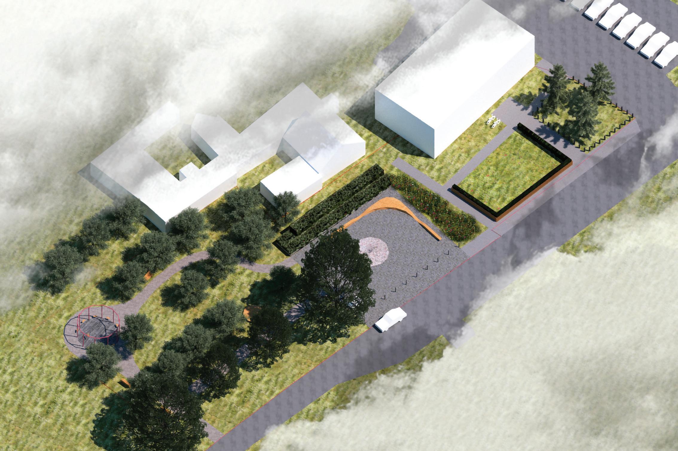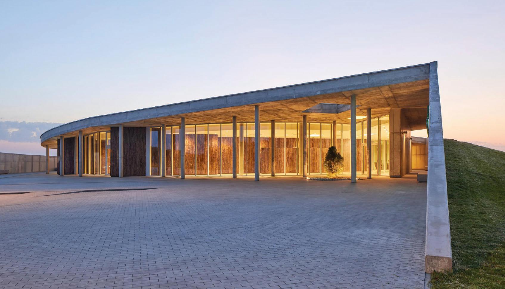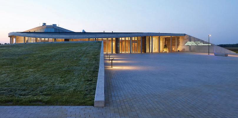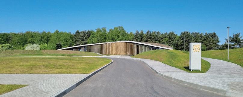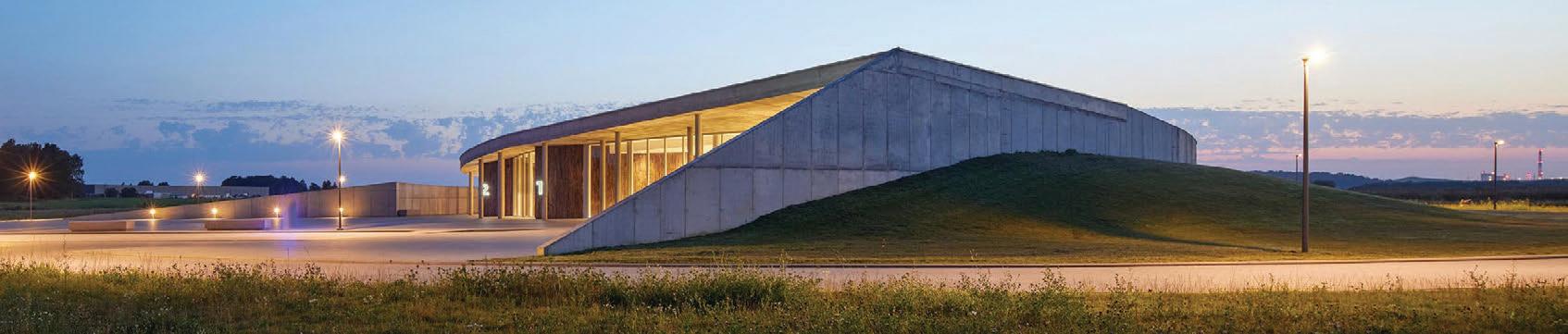 The crematorium is located on a flat sur face – in a field by the forest. The mass concept of the design is a rather sensitive manner –it represents a shallow hill rising from the sur face. The crematorium is designed with a metaphor of a burial mound covered with white linen. The volume of the building and its access spaces are separated by embankments of the surrounding landscape. The structure of the roof is reminiscent of a ritual blanket that covers the architectural volume and blends it into the surrounding ground. The crematorium building is visible from a distant perspective and becomes the epicentre of the ritual. It calmly invites and releases those who arrive. It is a place of emotional discharge and a quiet transformation subordinate to the eternal time and the experience of eternity.