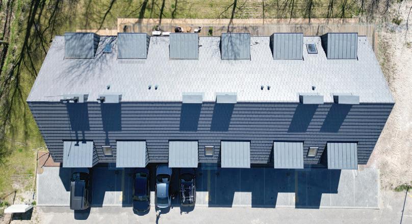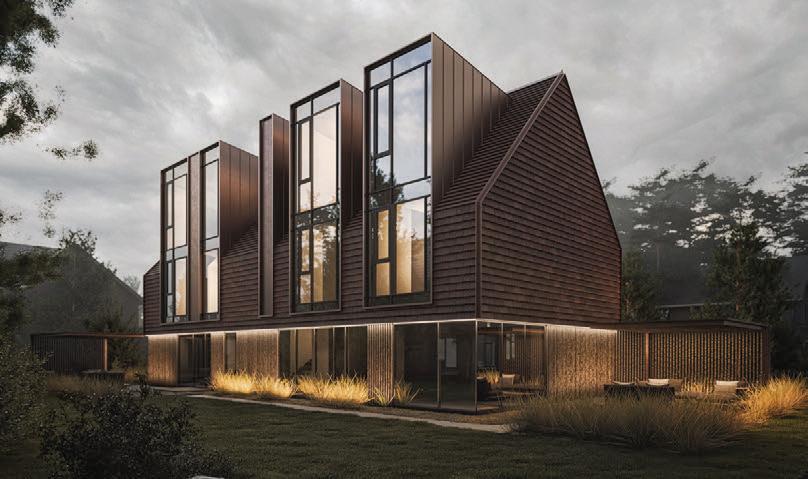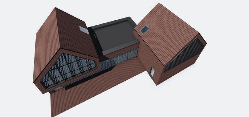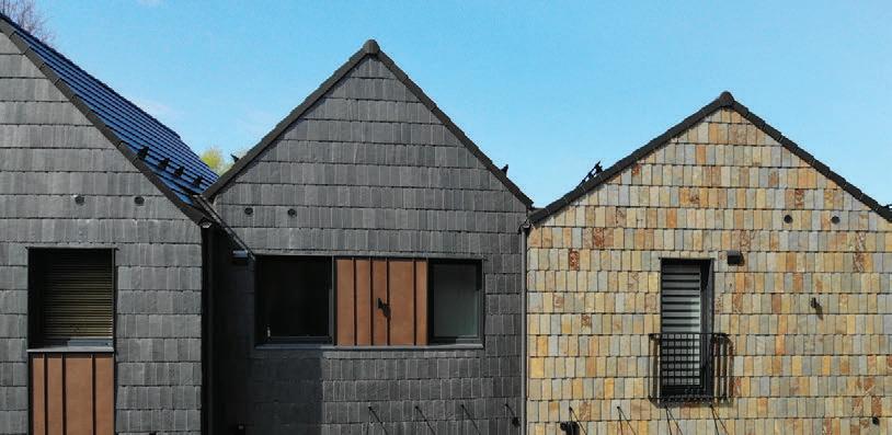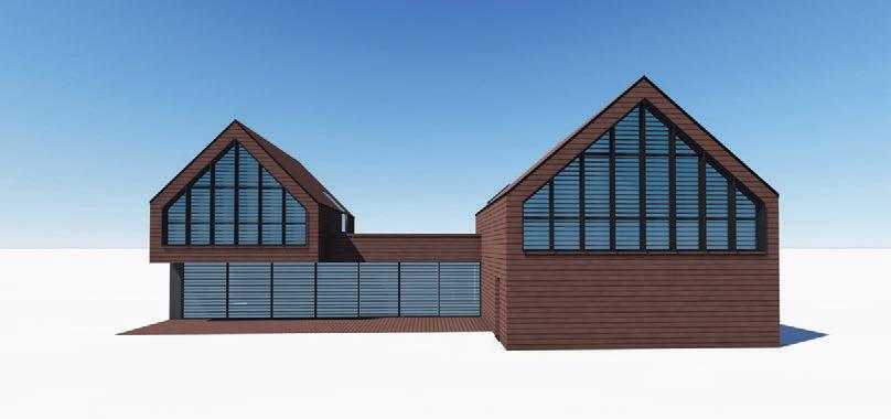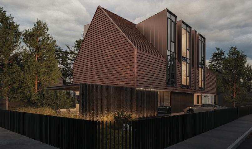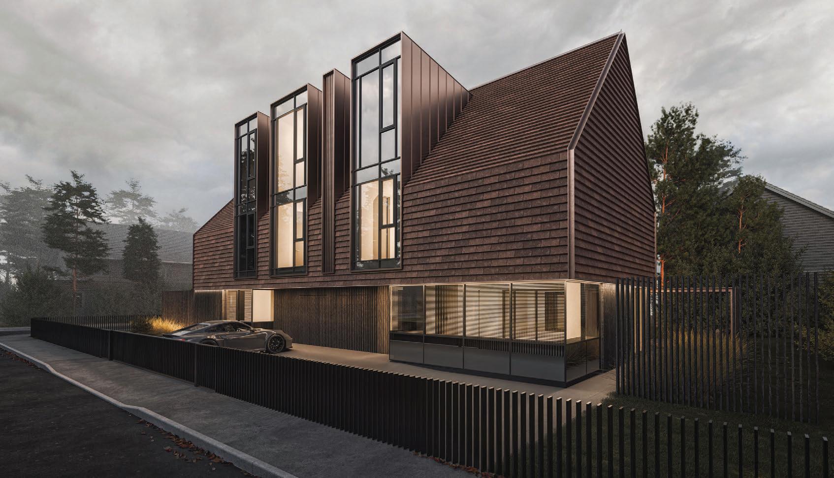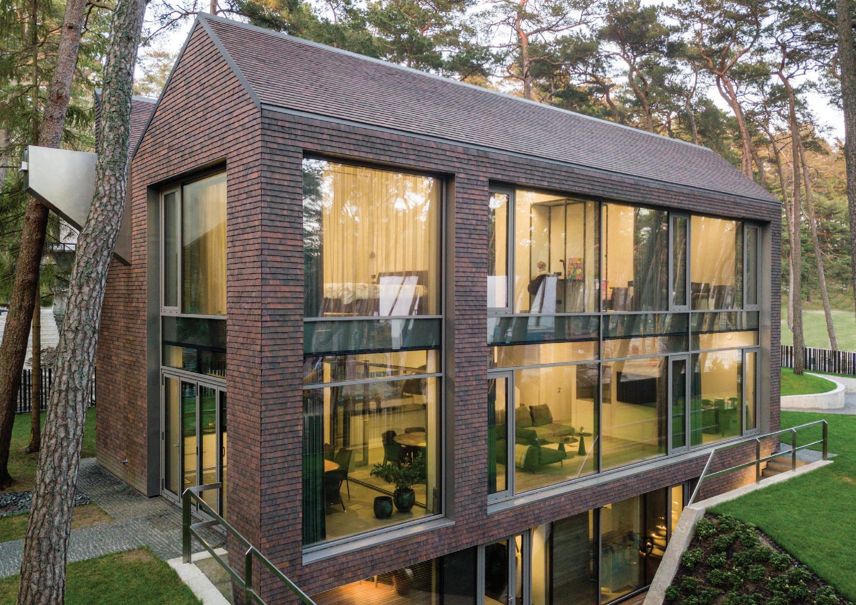 Šlaitiniai stogai, medinė dekoratyvi vertikalių elementų fasado apdaila – šiuolaikiška tradicinės Neringos architektūros interpretacija su šiam kraštui būdingais statinio elementais – lėkiais, langinėmis.