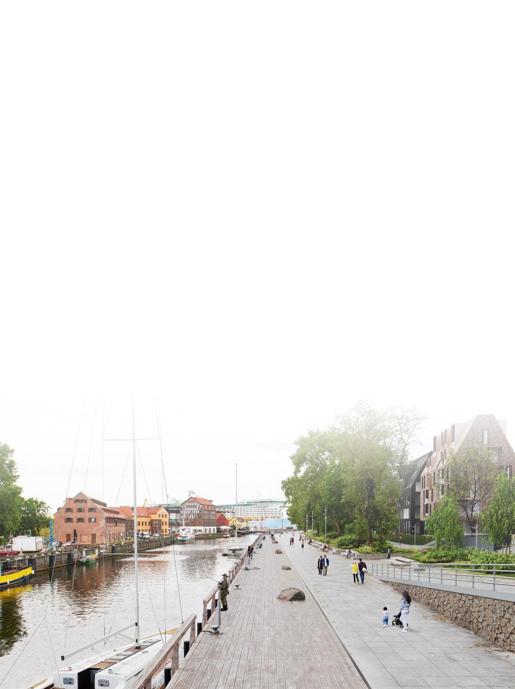 • Moderni ir patogi viešoji erdvė miestiečiams. Tai platūs takai ir praėjimai, žaidybinis elementasskulptūra prie marių ir kelto, skirtingos poilsio erdvės - daug suolelių su vaizdu į vandenį ir po medžiais, krantinė-turėklas pasirėmus stebėti uostą.