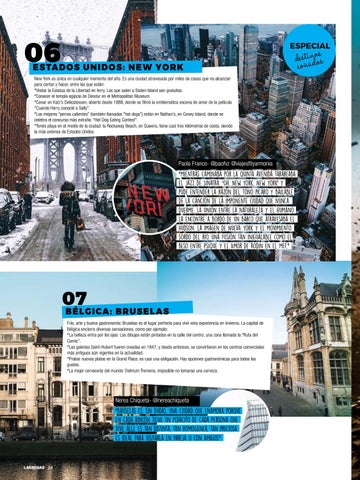 ESTADOS UNIDOS: NEW YORK New York es única en cualquier momento del año. Es una ciudad atravesada por miles de cosas que no alcanzan para contar y hacer, entre las que están: *Visitar la Estatua de la Libertad en ferry. Los que salen a Staten Island son gratuitos. *Conocer el templo egipcio de Dendur en el Metropolitan Museum. *Cenar en Katz’s Delicatessen, abierto desde 1888, donde se filmó la emblemática escena de amor de la película “Cuando Harry conoció a Sally”. *Los mejores “perros calientes” (también llamados “hot dogs”) están en Nathan’s, en Coney Island, donde se celebra el concurso más extraño: “Hot Dog Eating Contest”. *Tenés playa en el medio de la ciudad: la Rockaway Beach, en Queens, tiene casi tres kilómetros de costa, siendo la más extensa de Estados Unidos.