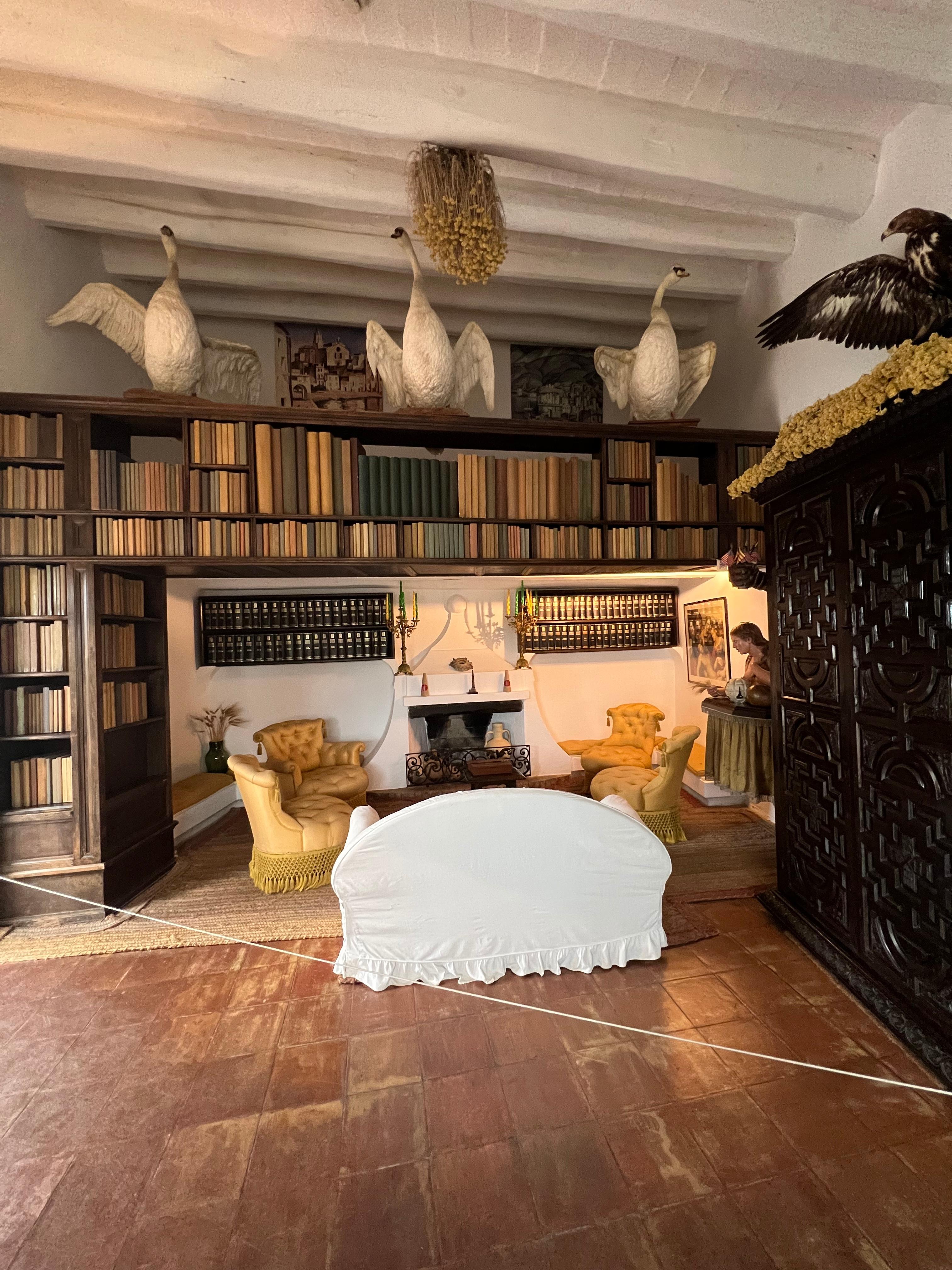 E l s a l ó n d e l o s o c o n u n e j e m p l a r v e r d a d e r o ( e m b a l s a m a d o c l a r o ) q u e l e e n v i ó s u a m i g o e l e s c r i t o r E s c o c e s E d w a r d J a m e s L o s c i s n e s ( h a y v a r i o s ) q u e s e e n c u e n t r a n e n l a b i b l i o t e c a y e l e s t u d i o , e r a n m a s c o t a s s u y a s q u e f u e r o n m u r i e n d o y é l l a s f u e h a c i e n d o e m b a l s a m a r E n s u h a b i t a c i ó n h a y u n a p e q u e ñ í s i m a j a u l a ( m u y p e q u e ñ a ) d o n d e g u s t a b a p o n e r u n g r i l l o e n l a n o c h e p a r a e s c u c h a r l o y d o r m i r s e c o n s u “ c a n t o ” . U n e s p e j o e s t r a t é g i c a m e n t e u b i c a d o e n u n a p a r e d l e p e r m i t í a , m e d i a n t e o t r o e s p e j o c e r c a d e l a c a m a , v e r d e s d e a l l í e l a m a n e c e r y p r e s u m i r d e s e r e l p r i m e r E s p a ñ o l e n v e r e l s o l a s o m a r s o b r e e s e p a í s . ( P o r t l i g a t e s e l p u n t o m a s a l e s t e d e E s p a ñ a )