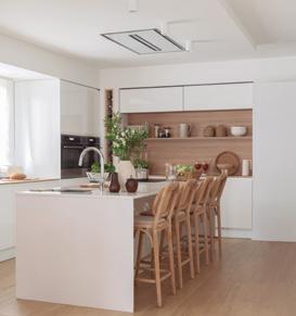 La cocina, en blanco y madera clara, queda totalmente abierta al comedor y al salón, únicamente unas lamas verticales fijas en un lateral delimitan visualmente este espacio del resto. La isla central, en un blanco brillante como el resto de los armarios, cuenta con una amplia zona de desayuno con 4 taburetes de madera. La campana extractora queda discretamente empotrada en el techo.