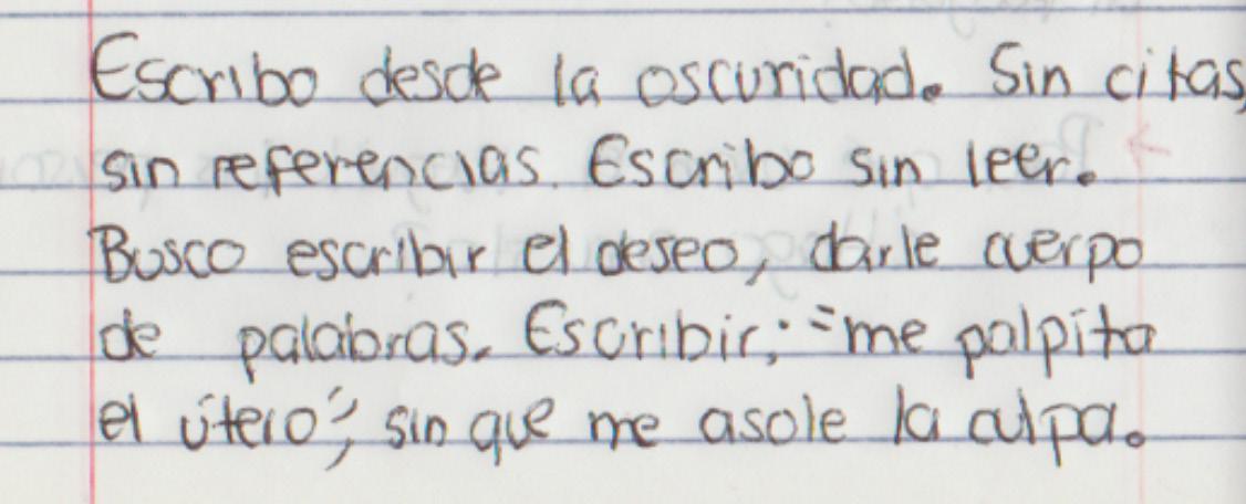 Hace algunos años, durante un taller de cuento, alguien comentó que suele revelársele lo que desea decir mientras escribe, no antes. La mediadora en turno, reprochó extrañada que no, que para escribir tienes que conocer qué buscas comunicar, a dónde vas a llegar. Yo, fan de renegar de las reglas y las instrucciones que de cualquier modo no retengo con normalidad, después de escuchar aquello me aferré a escribir sin rumbo. Luego me enrolé en un posgrado y los lineamientos académicos me desviaron de mi rumbo sin rumbo. Pero no quité el dedo de la llaga: me interesa el acuerpamiento de la escritura y los procesos individuales y colectivos que la permiten como modos otros del acontecer literario.