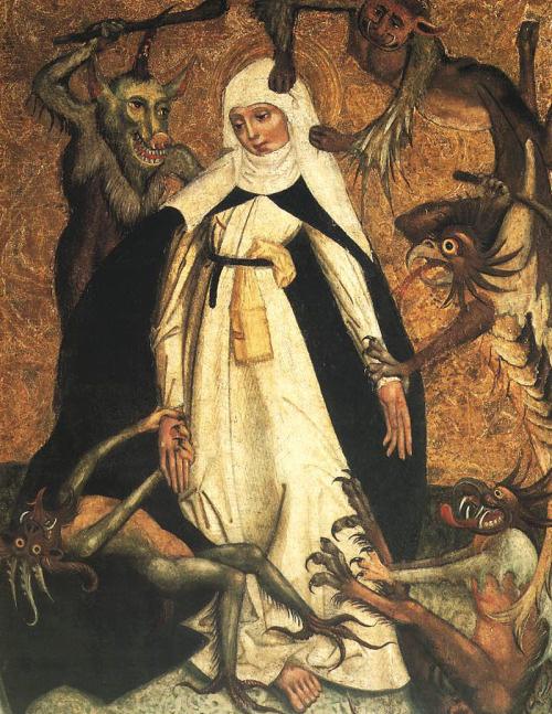 Existe una pintura anónima de alrededor del siglo XVI, en la que Santa Catalina de Siena (1347-1380) aparece rodeada por cinco demonios que la asedian, mientras estos seres le estrujan el hábito y los brazos, ella parece resignada al tormento, su expresión es impasible y, si bien se ve agotada, incluso pareciera que sonríe. Sin intenciones de desacreditar la imagen beatífica, pienso en la vida de la chica y entiendo que no haga frente al sitio.