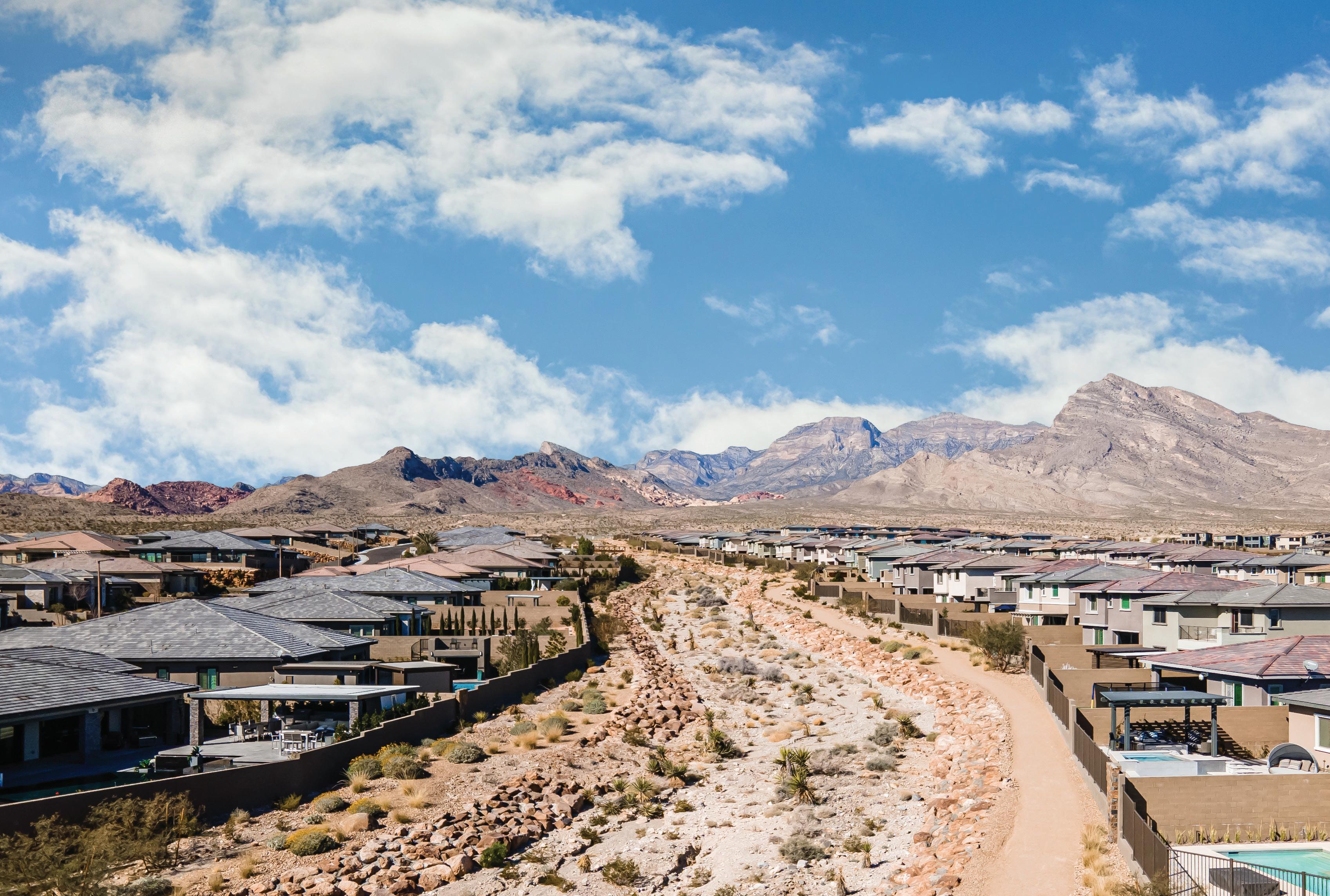 For example, in the village of Stonebridge, native vegetation was left intact within an expansive drainage wash that handles a high volume of water from adjacent Red Rock Canyon National Conservation Area during a storm event. Native plants within the wash slow and filter stormwater as it travels downstream, preserving the area’s natural aesthetic by avoiding use of more traditional concrete-lined channels. The wash is fortified with large boulders designed to mitigate erosion and hold in place the integrity of the channel. A hard-packed earthen walking trail planted with native vegetation and drought tolerant landscape runs along one side of the wash, while periodic pedestrian bridges connect both sides of the wash.