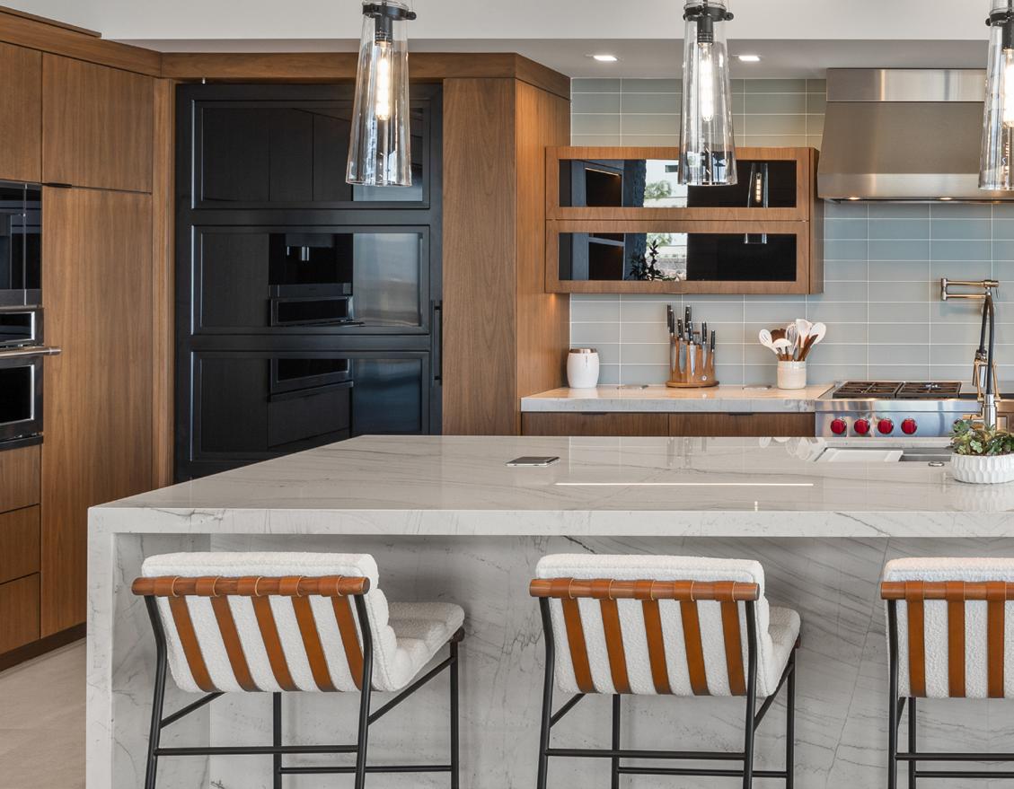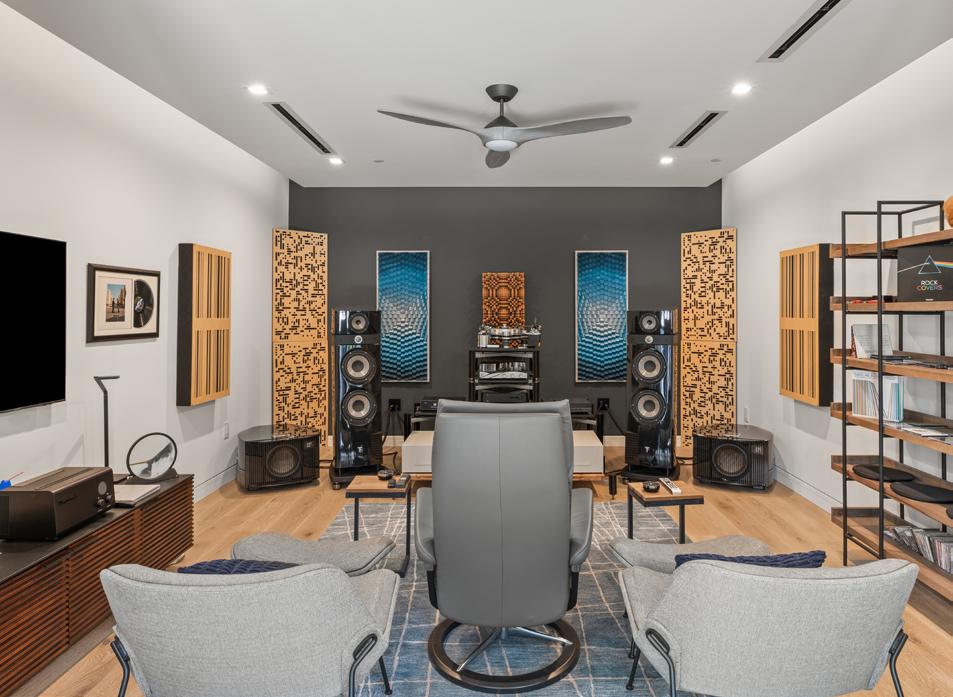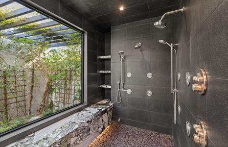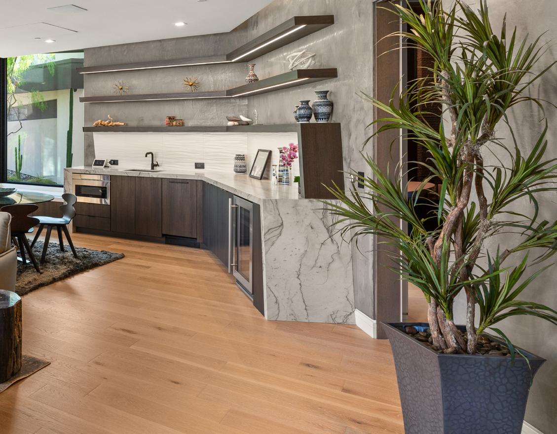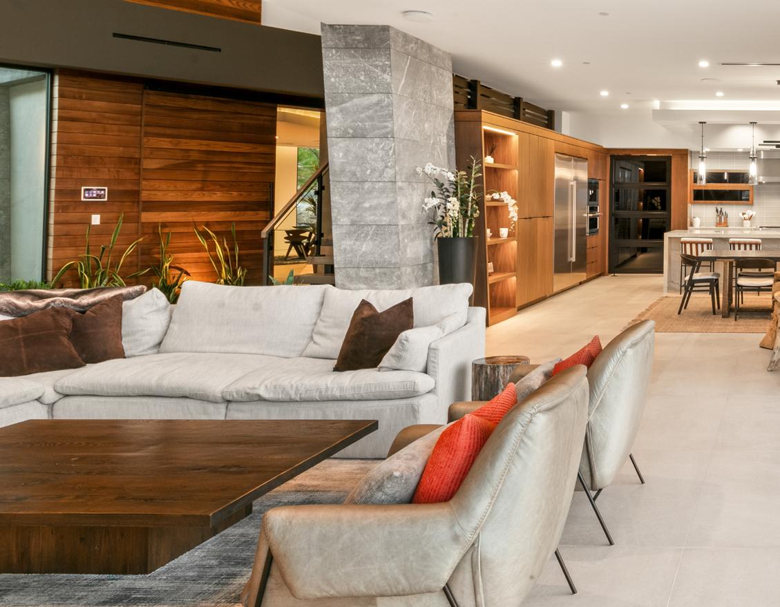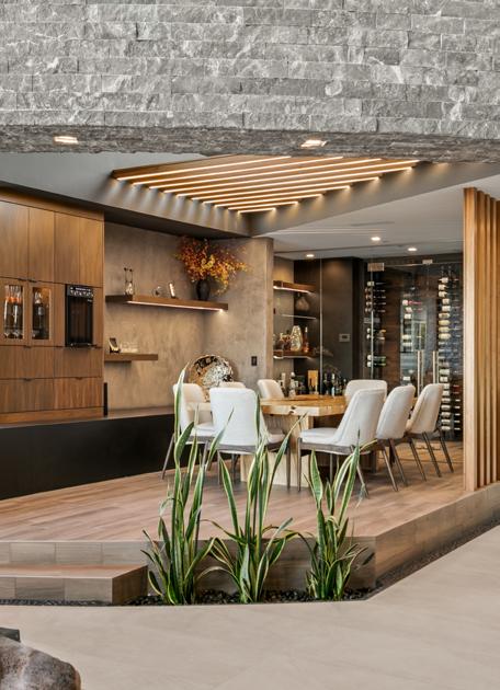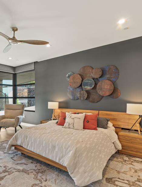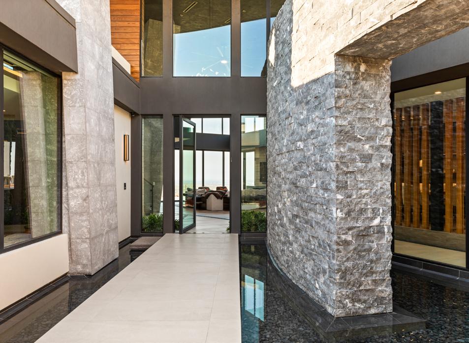 Upon arrival, the home’s dramatic front entrance greets you with striking water and fire features, setting the tone for the remarkable experience that lies within. Inside, the open floor plan is flooded with natural light, highlighting the home’s organic wood and stone elements, adding warmth and balance to its sleek, modern design.