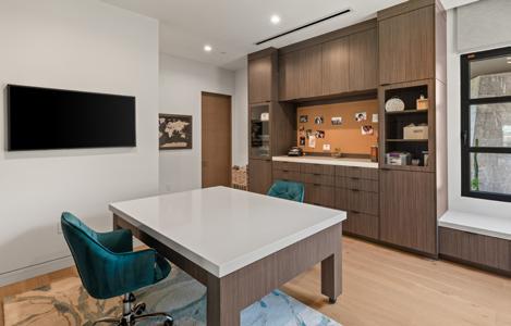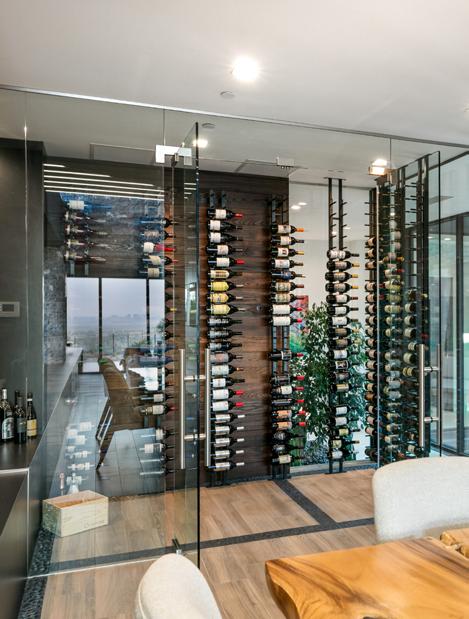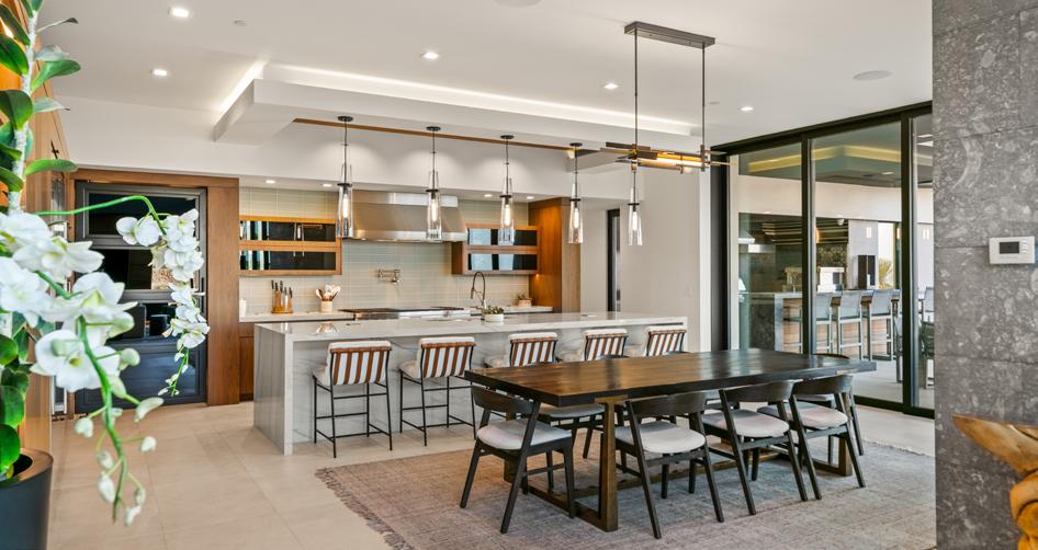 Designed for both grand entertaining and intimate gatherings, the home features a large chef’s kitchen with an oversized waterfall island, upgraded stainless steel appliances, wood cabinetry, and a separate full prep kitchen. The adjacent casual dining area, with pocket sliding doors, opens to a fully covered outdoor kitchen with a spacious seating area, perfect for al fresco dining. In addition, a formal dining room offers an elegant space for more refined occasions, complemented by a large, temperature-controlled wine room.