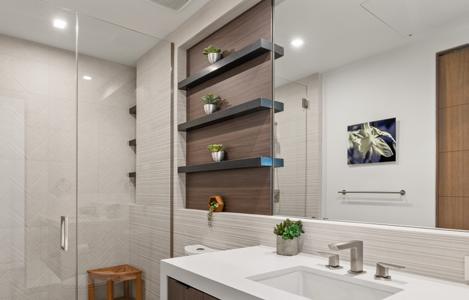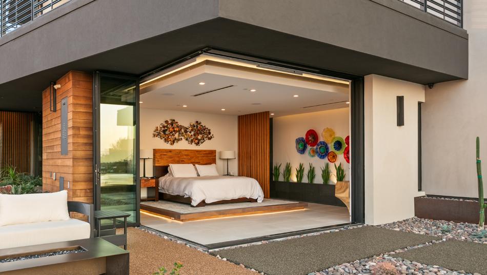 The primary suite, located on the main level, is nothing short of a private retreat. With pocket sliders that lead directly to the infinity-edge pool and spa, it effortlessly blends the indoors with the outdoors. The spa-like bathroom exudes luxury with its freestanding stone soaking tub, oversized multi-head shower, and river rock accents.