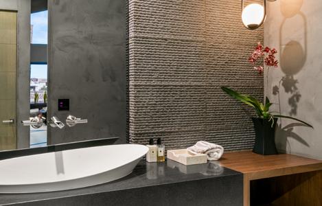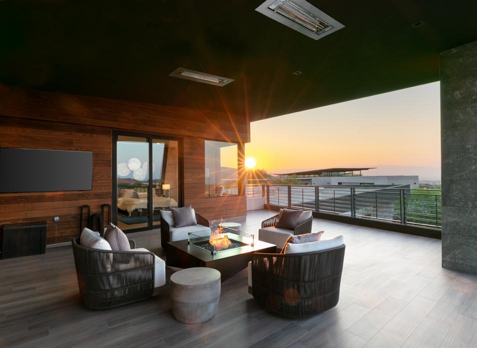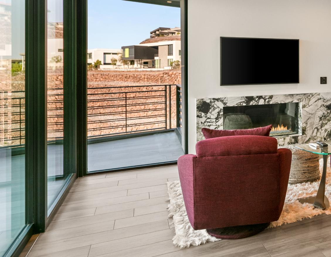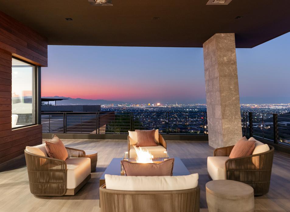 Multiple outdoor fire lounge areas, terraces, and an infinity-edge pool with spa offer breathtaking Strip views, enhancing the sense of living in a private luxury resort.