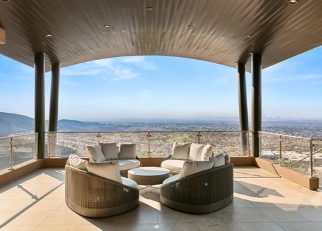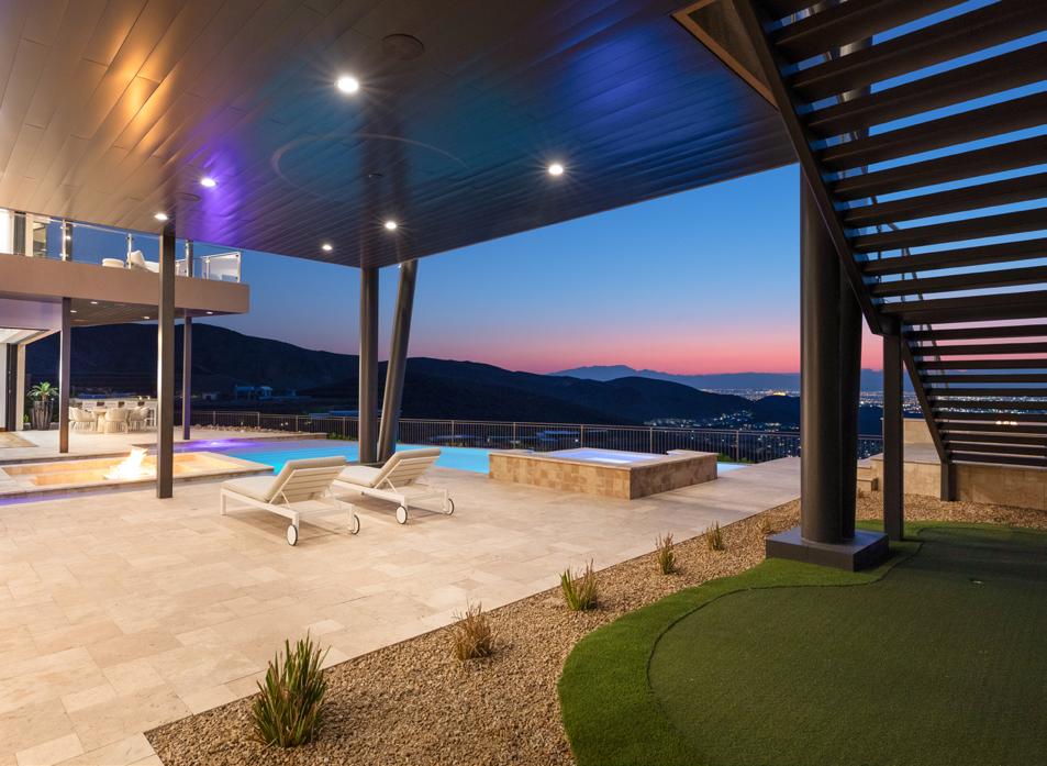All five bedrooms are en-suite, four with balcony access. Grand stairs lead down to the backyard, featuring an oversized infinity pool designed around a fire pit lounge. There is an extensive covered patio in the back to enjoy the views.