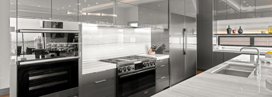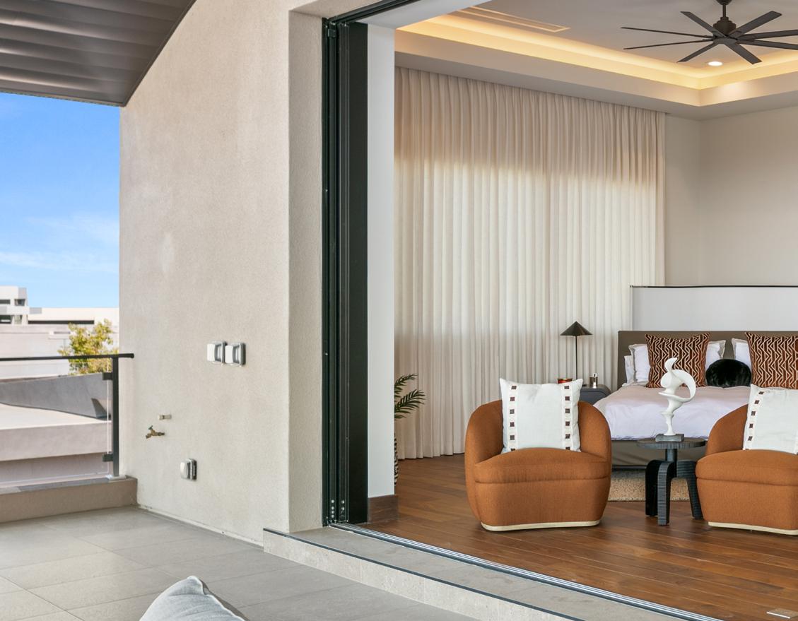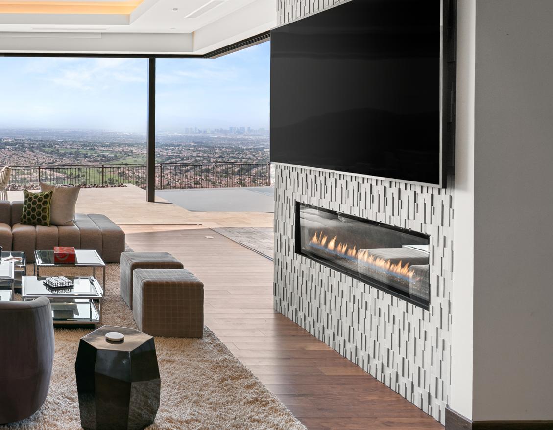 The main level is perfect for entertaining. Disappearing glass walls seamlessly merge the indoor and outdoor experience. The family room hosts a cozy fireplace, a full wet-bar with dramatic marble counter. Disappearing pocket doors exit to the full outdoor BBQ kitchen framed by views of the city.