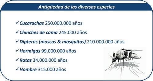 dores sinantrópicos, cuyas hembras pueden gestar en 21 días hasta 9 gazapos que alcanzarán su madurez sexual al cabo de 3 meses. Biológicamente, la gran diferencia a nuestro favor es la longevidad, factor que el resto de las especies compensan y/o exceden, en cantidad de generaciones por año. Nuestra especie se encuentra hace 315.000 años en el planeta, mientras que las cucarachas ya llevan 250 millones de años en la faz de la tierra (gráfico 2). Sin entrar en terrenos filosóficos, simplemente siendo realistas y aplicando sentido común (no siempre el mas común de los sentidos), podremos darnos cuenta de que la aniquilación o erradicación de cualquier especie de organismo que nos anteceda sería una fantasía. El pontencial biótico que manifiestan los organismos plaga es sumamente elevado y tiene relación directa con la cantidad de descendientes que puede generar cada hembra por ciclo, la celeridad con la que alcanzan la madurez y la superposición de generaciones por año. En muchas de las especies, principalmente las que desarrollan dentro de estructuras, las condiciones medioambientales no afectan el desarrollo normal de las colonias y la superposición de diferentes cohortes es continua. Estas capacidades favorecen rotundamente el desarrollo de ventajas adaptativas y la expresión de genes que confieren resistencia frente a las acciones de presión selectiva que puede utilizar nuestra especie (ej.: aplicación irracional de plaguicidas).