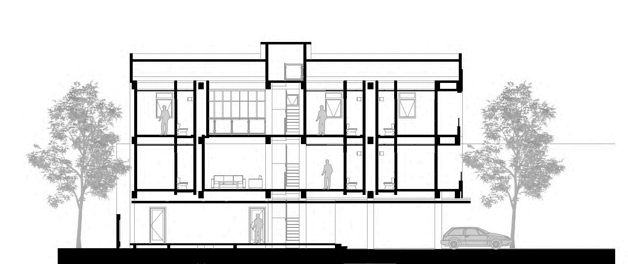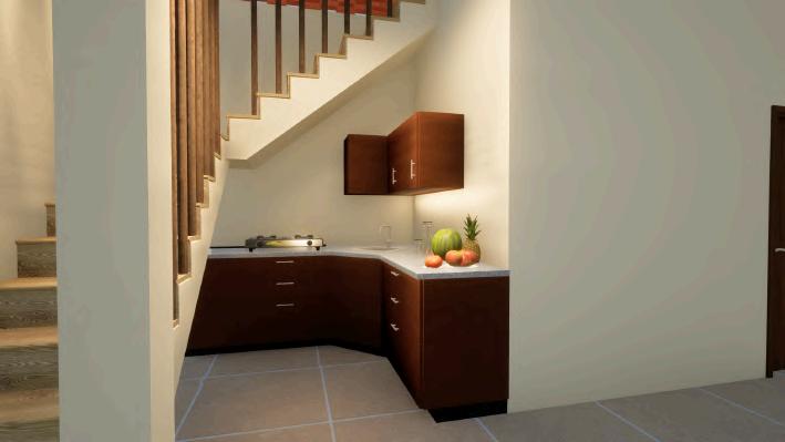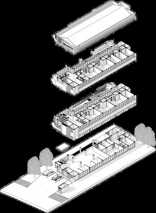 Bangunan kost dengan 3 lantai, dimana lantai 1 berfungsi sebagai retail caffe dan area privat pemilik kost. Lantai 2 dan 3 berfungsi sebagai area kamar kost yang dilengkapi ruang komunal di lantai 2.