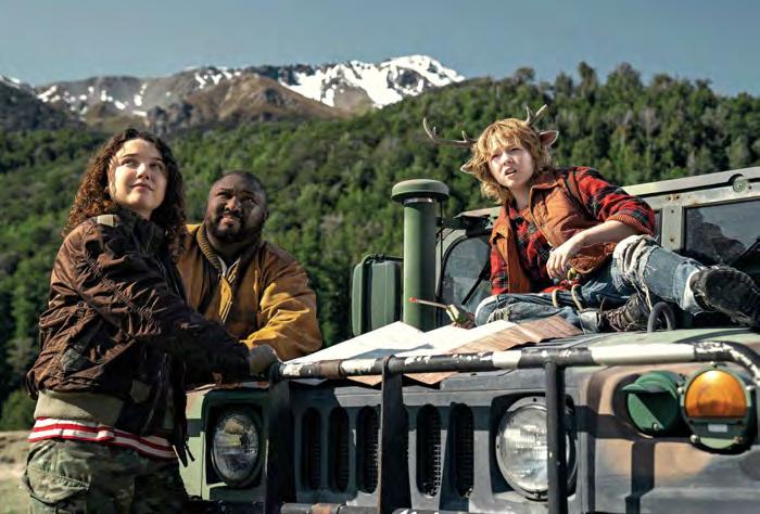 ↑ Stefania LaVie Owen, left, Nonso Anozie, Christian Convery in “Sweet Tooth.”