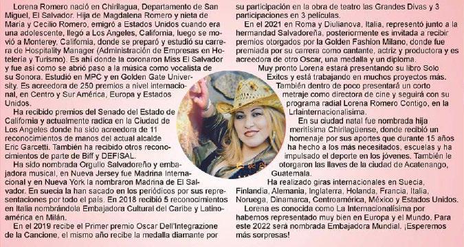 Cabe destacar sus múltiples proyec tos además de ser una Empresaria admirable, Las personas que tene mos el gusto de conocerla sabemos su profesionalismo, dedicación y ese enorme corazón que siempre la man tienen muy unida a su público.