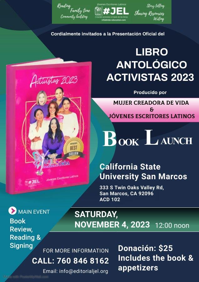 Editorial Jóvenes Escritores Latinos y Mujer Creadora De Vida se complace en presentar el gran logro de sus Activitas Comunitarias 2023: Crystal, Diana, Becky, Guille, Dalia y Beba. Estas grande y extraordinarias mujeres contaron con el apoyo incondicional, guía y mentoría de lideres comunitarios y activistas de renombre que fueron parte fundamental en el proceso y crecimiento de ser activistas comunitarias. Rocio Resendiz Coach de vida, enfatiza que ser una mujer activista es estar al servicio de la humanidad, activar a más personas a unirse por una causa en beneficio de la comunidad. Es poner en práctica su liderazgo en amor, unidad, compromiso y responsabilidad. Dejando un legado de vida a futuras generaciones. Por otro lado, Miriam Burbano Presidenta de la Editorial Jóvenes Escritores Latinos(#JEL), comenta que el éxito del libro Activistas Comunitarias 2023 de la organización Mujer Creadora de Vida, tiene un significado muy especial y triple valor para ella, ya que no solo habla de las historias de las mujeres de poder en la comunidad sino también de sus actividades para el bienestar de la comunidad, además del hecho de convertirse en best seller en la Plataforma más competitiva e importante para los escritores en el planeta.