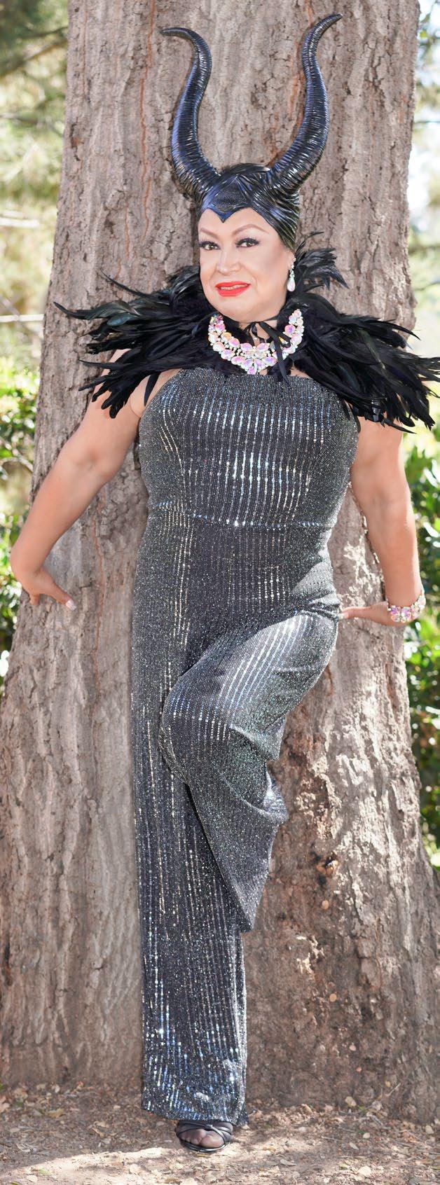 Marilyn fungió como modelo, ella tiene una per sonalidad fuerte y lo refleja en estas fotografías con un maquillaje de su inspiración, el vestuario tiene un gran aplique de colores en la parte supe rior contrastando con el color negro del vestido y unas largas botas quedando muy ad hoc con el atuendo. La corona de finas flores adornando su cabeza quedó impresionante.