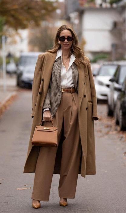 Totallookenmarrón/cacao:abrigoo blazer,jerseydecuelloaltoypantalón delmismotono.Accesoriosdiscretos ygafasnegras.