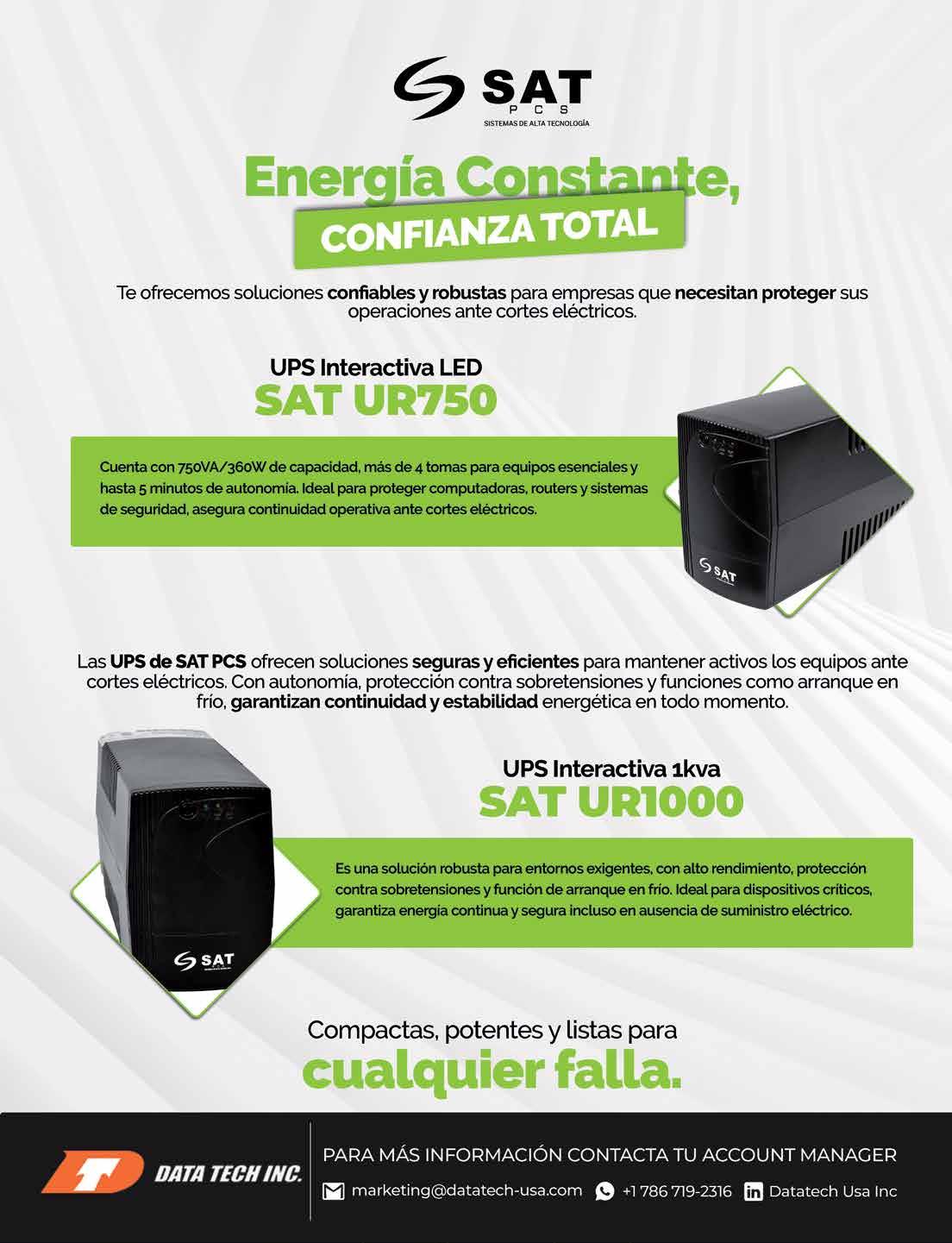 SAT, marca reconocida por su innovación y eficiencia en soluciones de energía, presenta dos modelos diseñados para pequeñas y medianas empresas que buscan protección sin complicaciones: las UPS interactivas UR1000 y UR750. Ambas están disponibles a través de Data Tech, distribuidor autorizado que ofrece atención especializada y disponibilidad inmediata.
