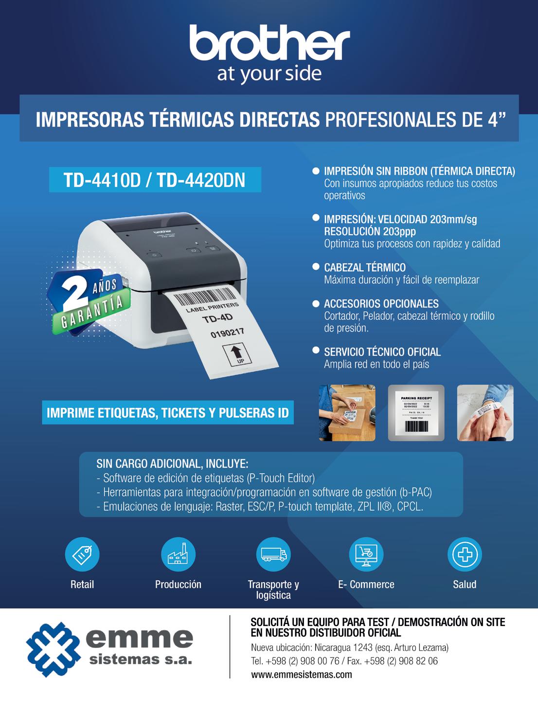 La serie TD-4D incluye 2 modelos de tecnología térmica directa, TD-4410D y TD-4420DN (con conexión en red). Estos equipos ofrecen diversos beneficios como una impresión sencilla y de alta velocidad de etiquetas, tickets/recibos, pulseras de identificación, y una integración perfecta con los sistemas existentes en la empresa y un diseño modular para poder imprimir desde cualquier lugar.