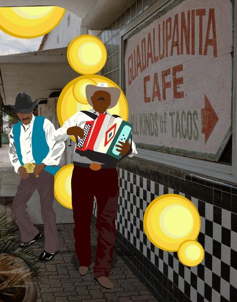 ElProgresso:Ilustrationofamanplayingaccordionandhsbrotherdancingbehindhimas theystrollbesideEProgressobuildingonGuadalupeStreet