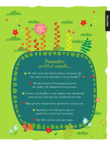 Demuestro gratitud cuando… Me doy cuenta de todo lo bueno y hermoso que me rodea, en la naturaleza y en mi familia. Me doy cuenta de los pequeños gestos de cariño y de simpatía de las personas. Cuento a mi familia o a mis amigos cuán agradecido estoy por las cosas que me ocurrieron en el día. Digo gracias a las personas que hacen cosas por mí. Agradezco a la vida por lo que yo puedo dar o hacer por los demás. Soy feliz con las cosas que tengo.