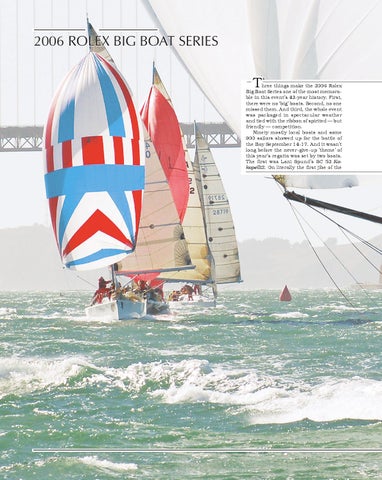 hree things make the 2006 Rolex Big Boat Series one of the most memorable in this event's 42-year history. First, there were no ‘big’ boats. Second, no one missed them. And third, the whole event was packaged in spectacular weather and tied with the ribbon of spirited — but friendly — competition. Ninety mostly local boats and some 900 sailors showed up for the battle of the Bay September 14-17. And it wasn't long before the never-give-up 'theme' of this year's regatta was set by two boats. The first was Lani Spund's SC 52 Kokopelli2. On literally the first jibe of the