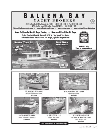 1150 Ballena Blvd. #121, Alameda, CA 94501 ✦ (510) 865-8600 ✦ Fax (510) 865-5560 2736 Shelter Island Drive, San Diego, CA 92106 ✦ (619) 523-1151 Victoria@ballenabayyachts.com ✦ www.ballenabayyachts.com ✦ www.trawlers.com ✦ www.yachtworld.com/ballenabay