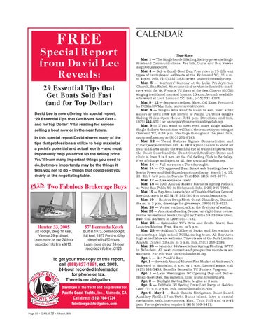 CALENDAR Non-Race Mar. 1 — The Singlehanded Sailing Society presents Single Sideband Communications. For info, Lucie and Ben Mewes sstp06@yahoo.com. Mar. 4 — Sail-a-Small-Boat Day. Free rides in 15 different types of centerboard sailboats at the Richmond YC, 11 a.m. to 4 p.m. Info, (510) 237-2821 or see www.richmondyc.org. Mar. 5 — Mariners' Sunday at St. Luke Presbyterian Church, San Rafael. An ecumenical service dedicated to mariners with the St. Francis YC Sons of the Sea Chorus (SOTS) singing traditional nautical hymns. 10 a.m., brunch available afterward at Loch Lomond YC. Info, (415) 721-4273. Mar. 8 - 12 — Sacramento Boat Show, Cal Expo. Produced by NCMA/SVMA. Info, www.svmainc.com. Mar. 8 — Singles who want to learn to sail, meet other sailors or need crew are invited to Pacific Currents Singles Sailing Club's Open House, 7:30 p.m. Directions and info, (805) 444-6711 or www.pacificcurrentssailingclub.org. Mar. 9 — If you want to meet even more single sailors, Single Sailor's Association will hold their monthly meeting at Oakland YC, 6:30 p.m. Meetings throughout the year. Info, www.sail.ssa.org or (510) 273-9763. Mar. 12 — Visual Distress Signals Demonstration and Clinic (postponed from Feb. 4). Here's your chance to shoot off your old flares under the watchful eye of trained experts from the Coast Guard and the Coast Guard Auxiliary. Demo and clinic is from 3 to 6 p.m, at the Cal Sailing Club in Berkeley. Free of charge and open to all. See www.cal-sailing.org. Mar. 14 — Full moon on a Tuesday night. Mar. 14 — CG-approved Boat Smart safe boating class by Marin Power and Sail Squadron at no charge, March 14, 15, 21, 22; 7 to 9 p.m. in Novato. Text $30. (415) 883-6777. Mar. 17 — Kiss someone Irish! Mar. 18 — 10th Annual Master Mariners Spring Potluck at Point San Pablo YC in Richmond. Info, (925) 935-7096. Mar. 19 — Bay Area Association of Disabled Sailors General Meeting, open to all! (415) 383-5816 or www.baads.org. Mar. 19 — Boaters Swap Meet, Coast Chandlery, Oxnard. 8 a.m. to 3 p.m, drawings for giveaways. (805) 815-4520. Mar. 20 — Vernal equinox, a.k.a. the first day of spring. Mar. 25 — American Boating Course, an eight-hour course for the recreational boater, taught by Flotilla 10-03 (Stockton), $40. Call Barbara at (209) 983-1330. Mar. 25 — Spinnaker YC's Arts and Crafts Show, San Leandro Marina. Free, 9 a.m. to 5 p.m. Mar. 25 — Oakland's Office of Parks and Recreation is sponsoring a high school PCISA racing team. All Bay Area high school kids are welcome. Tryouts are at the Jack London Aquatic Center, 10 a.m. to 3 p.m. Info, (510) 238-2196. Mar. 25 — Islander 36 Association Spring Meeting, SFYC in Belvedere. All past, current and prospective members are welcome. For info visit www.islander36.org. Apr. 1 — Get Punk'd Day. Apr. 1 — Seventh Annual Marine Flea Market at Anderson's Boatyard in Sausalito, 8 a.m. to 1 p.m. Limited space, call (415) 332-5432. Benefits Sausalito YC Juniors Program. Apr. 1 — Lake Washington SC Opening Day and Sail-aSmall-Boat-Day, Sacramento. Info: www.lwsailing.org. Apr. 2 — Daylight Saving Time begins at 2 a.m. Apr. 5 — Latitude 38 Spring Crew List Party at Golden Gate YC, 6 to 9 p.m. Info, www.latitude38.com. Apr. 6 - May 1 — Basic Coastal Navigation, Coast Guard Auxiliary Flotilla 17 on Yerba Buena Island. Intro to coastal navigation, tools, instruments. Mon., Thur. 7:15 p.m. to 9:45 p.m. Pre-registration required, (415) 399-3411.