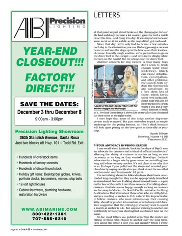 LETTERS at that point we just about broke out the champagne, for our life had suddenly become a lot easier. I gave the turf a quick rinse this time, and hung it to dry. It was important to leave some scent on it for awhile so the dogs didn't get confused. Since that day, we've only had to devote a few minutes each day to the elimination process. On long passages, we can heave to and run the dogs up to the bow — on their leashes, of course. In really rough weather, we've gotten them to go on the Astro Turf in the cockpit — and even in the dinghy while its been on the davits! But we always use the Astro Turf. Another concern for dog owners is that many dogs don't seem to drink enough water while underway, which can cause dehydration, constipation, and other problems. Fortunately, both my dogs like watermelon and cantaloupe, so I feed them lots of those, which keeps them well-hydrated. Some dogs will also be more inclined to drink 'Leader of the pack' Sandy Tilbury with her water if you put a very terriers Maggie and McDougal. small amount of milk in it. I've had them drink it down like crazy after they'd turned up their nose at straight water. I sure hope that some of this helps another dog-crazy person such as myself. But just remember to pick an empty anchorage for the peeing lessons, as I don't think humans will look upon peeing on the bow quite as favorably as your dogs. Sandy Tilbury Stormcat, Hunter 41 DS Vancouver, B.C. ⇑⇓YOUR ADVOCACY IS WRONG-HEADED I can recall when Latitude, back in the days of Big O, was an advocate for cruisers and critical of 'official interference' affecting the ability of cruisers to anchor as long as was necessary or as long as they wanted. Nowadays, Latitude advocates for a larger role by government in controlling how long and where we may anchor. It's not clear to me why this is so. Perhaps if you pulled out the stops and revealed your class bias by saying exactly what you think about the so-called 'anchor-outs' and 'liveaboards', I'd get it. I'm not talking about the folks who leave their boats unattended long enough that they can be appropriately described as abandoned. Nor am I talking about moored boats — a pox on the face of the earth if ever there was one. I'm talking about cruisers. Latitude seems happy enough as long as cruisers are far away in Mexico, the South Pacific, and other far flung destinations. But what about those of us who are still plying, and yes, needing to anchor in U.S. waters? It is impracticable to believe cruisers, who must micromanage their cruising kitty, should be pushed into marinas or onto buoys with fees. Your suggestion that the retired guy who may want to spend a month at anchor is o.k., but anyone wanting to anchor out indefinitely reveals your shortsighted and biased take on the issue. So far, most letters you publish regarding the matter are critical of those who choose to anchor over the long term. How about the letter I sent you last month? When I wrote
