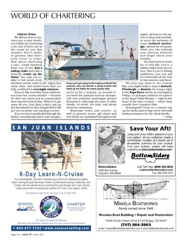 WORLD OF CHARTERING region, giving you the option to shop and socialize, or savor the seclusion of some isolated anchorage, skirted by eel grass, where you can recharge your internal batteries and forget about your troubles. You don't have to travel far to feel like you're a million miles from the rat race. But if you're feeling ambitious, you can sail (or motorsail) all the way to Sacramento and back. On your way back to the Central Bay, you might make a stop at Antioch, Pittsburgh, or Benicia. Or, hang a right at the Napa River and do an overnight in Vallejo, or perhaps continue on upriver to the Napa Valley Marina — right in the heart of the wine country — where they usually have transient slips. Sound good? Trust us, a charter trip up the Delta and/or Bay rivers will yield lasting memories for the whole family. — andy LATITUDE / LADONNA