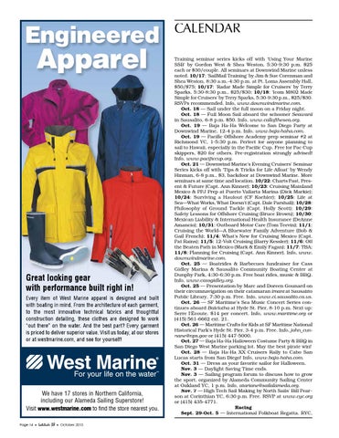 CALENDAR Training seminar series kicks off with 'Using Your Marine SSB' by Gordon West & Shea Weston, 5:30-9:30 p.m. $25 each or $30/couple. All seminars at Downwind Marine unless noted. 10/17: 'SailMail Training' by Jim & Sue Corenman and Shea Weston, 8:30 a.m.-4:30 p.m. at Pt. Loma Assembly Hall, $50/$75; 10/17: 'Radar Made Simple for Cruisers' by Terry Sparks, 5:30-8:30 p.m., $25/$30; 10/18: 'Icom M802 Made Simple for Cruisers' by Terry Sparks, 5:30-9:30 p.m., $25/$30. RSVPs recommended. Info, www.downwindmarine.com. Oct. 18 — Sail under the full moon on a Friday night. Oct. 18 — Full Moon Sail aboard the schooner Seaward in Sausalito, 6-8 p.m. $50. Info, www.callofthesea.org. Oct. 19 — Baja Ha-Ha Welcome to San Diego Party at Downwind Marine, 12-4 p.m. Info, www.baja-haha.com. Oct. 19 — Pacific Offshore Academy prep seminar #2 at Richmond YC, 1-5:30 p.m. Perfect for anyone planning to sail to Hawaii, especially in the Pacific Cup. Free for Pac Cup skippers, $20 for others. Pre-registration strongly advised! Info, www.pacificcup.org. Oct. 21 — Downwind Marine's Evening Cruisers' Seminar Series kicks off with 'Tips & Tricks for Life Afloat' by Wendy Hinman, 6-8 p.m., $3, backdoor at Downwind Marine. More seminars at same time and location. 10/22: Charts Past, Present & Future (Capt. Ann Kinner); 10/23: Cruising Mainland Mexico & PPJ Prep at Puerto Vallarta Marina (Dick Markie); 10/24: Surviving a Haulout (CF Koehler); 10/25: Life at Sea—What Works, What Doesn't (Capt. Dale Parshall); 10/28: Philosophy of Ground Tackle (Capt. Holly Scott); 10/29: Safety Lessons for Offshore Cruising (Bruce Brown); 10/30: Mexican Liability & International Health Insurance (DeAnne Amancio); 10/31: Outboard Motor Care (Tom Teevin); 11/1: Cruising the World—A Bluewater Family Adventure (Bob & Gail French); 11/4: What's New for Cruising Mexico (Capt. Pat Rains); 11/5: 12-Volt Cruising (Barry Kessler); 11/6: Off the Beaten Path in Mexico (Mark & Emily Fagan); 11/7: TBA; 11/8: Planning for Cruising (Capt. Ann Kinner). Info, www. downwindmarine.com. Oct. 25 — Boatrides & Barbecues fundraiser for Cass Gidley Marina & Sausalito Community Boating Center at Dunphy Park, 4:30-6:30 p.m. Free boat rides, music & BBQ. Info, www.cassgidley.org. Oct. 25 — Presentation by Marc and Doreen Gounard on their circumnavigation on their catamaran Imani at Sausalito Public Library, 7:30 p.m. Free. Info, www.ci.sausalito.ca.us. Oct. 26 — SF Maritime's Sea Music Concert Series continues aboard Balclutha at Hyde St. Pier, 8-10 p.m. Next up: Serre l'Écoute. $14 per concert. Info, www.maritime.org or (415) 561-6662 ext. 21. Oct. 26 — Maritime Crafts for Kids at SF Maritime National Historical Park's Hyde St. Pier, 3-4 p.m. Free. Info, john_cunnane@nps.gov or (415) 447-5000. Oct. 27 — Baja Ha-Ha Halloween Costume Party & BBQ in San Diego West Marine parking lot. May the best pirate win! Oct. 28 — Baja Ha-Ha XX Cruisers Rally to Cabo San Lucas starts from San Diego! Info, www.baja-haha.com. Oct. 31 — Dress as your favorite sailor for Halloween. Nov. 3 — Daylight Saving Time ends. Nov. 3 — Sailing program forum to discuss how to grow the sport, organized by Alameda Community Sailing Center at Oakland YC, 1 p.m. Info, atariane@sailalameda.org. Nov. 7 — High Tech Sail Making by North Sails' Bill Pearson at Corinthian YC, 6:30 p.m. Free. RSVP at www.cyc.org or (415) 435-4771. Racing Sept. 29-Oct. 5 — International Folkboat Regatta. RYC,
