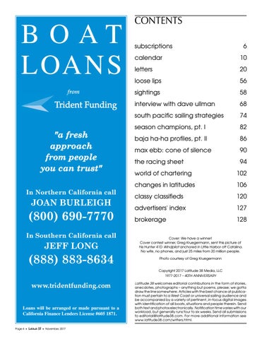 Cover: We have a winner! Cover contest winner, Greg Kruegermann, sent this picture of his Hunter 41D Windpilot anchored in Little Harbor off Catalina. No wife, no phones, and just 25 miles from 20 million people. Photo courtesy of Greg Kruegermann Copyright 2017 Latitude 38 Media, LLC 1977-2017 – 40TH ANNIVERSARY