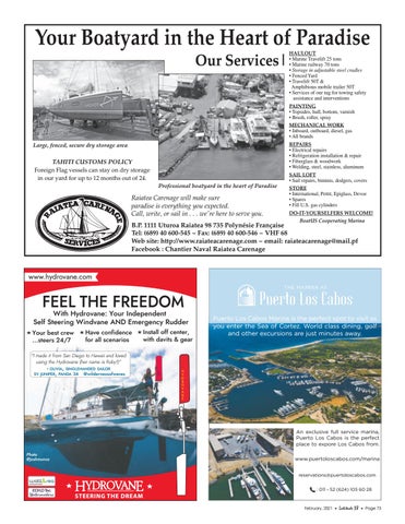 B.P. 1111 Uturoa Raiatea 98 735 Polynésie Française Tel: (689) 40 600-545 ~ Fax: (689) 40 600-546 ~ VHF 68 Web site: http://www.raiateacarenage.com ~ email: raiateacarenage@mail.pf Facebook : Chantier Naval Raiatea Carenage