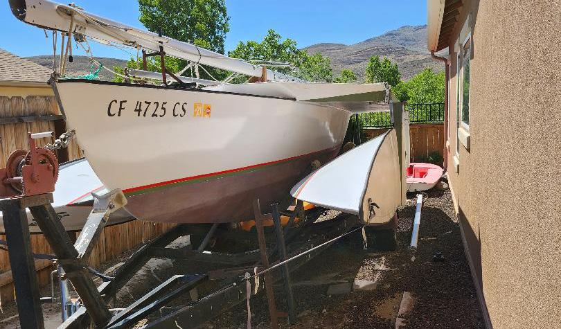 Lasco Nugget. Fiberglass hulls. Bought as a project. Replaced rotten crossmembers and cut the cabin off to make into a daysailer. Has all-new standing rigging and new full-batten main and new club jib. I made a crane setup to swing the amas into place. Has a 5 hp outboard. $7,500. Dayton, NV stu.wright@yahoo.com (775) 492-9525