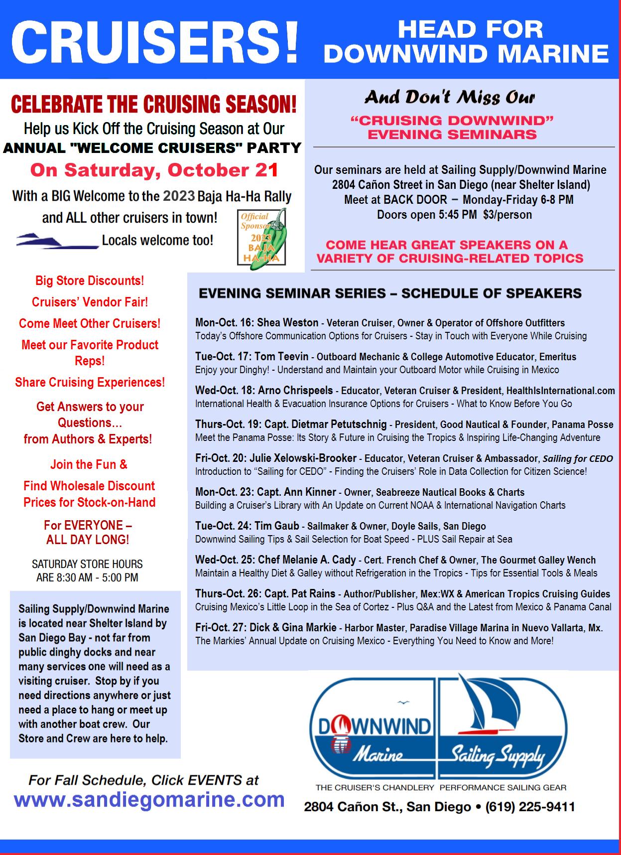Oct. 16-27 — Cruising Downwind Evening Seminars, Downwind Marine, San Diego, 6-8 p.m. 10/16: Today's Offshore Communication Options for Cruisers, Shea Weston, Offshore Outfitters. 10/17: Enjoy Your Dinghy! Understand