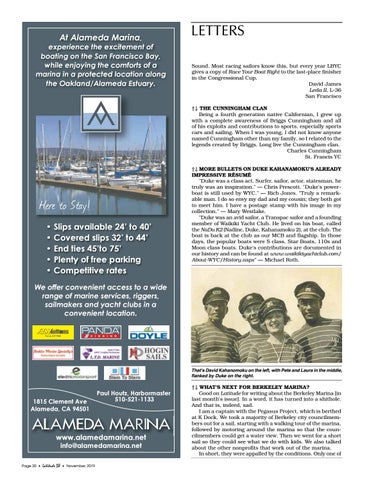 LETTERS Sound. Most racing sailors know this, but every year LBYC gives a copy of Race Your Boat Right to the last-place finisher in the Congressional Cup. David James Leda II, L-36 San Francisco ⇑⇓ THE CUNNINGHAM CLAN Being a fourth generation native Californian, I grew up with a complete awareness of Briggs Cunningham and all of his exploits and contributions to sports, especially sports cars and sailing. When I was young, I did not know anyone named Cunningham other than my family, so I related to the legends created by Briggs. Long live the Cunningham clan. Charles Cunningham St. Francis YC