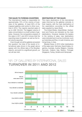 The SaleS To ForeiGn coUnTrieS the international market is responsible for approximately 15% of the volume of business of the galleries. at least 60% of the mapped galleries sold works to other countries in 2012. the majority reported sales of up to us$ 100,000. the biggest volume of sales concentrates in a small number of galleries. however, the comparative analysis of the sales in 2011 and 2012 shows that the exporting base increased, as well as the total volume exported. even though not all the galleries answered this question, the total of the results of international sales shown in the graph above agrees with the official data of the brazilian exports, and point to a significant growth, as we will see next.