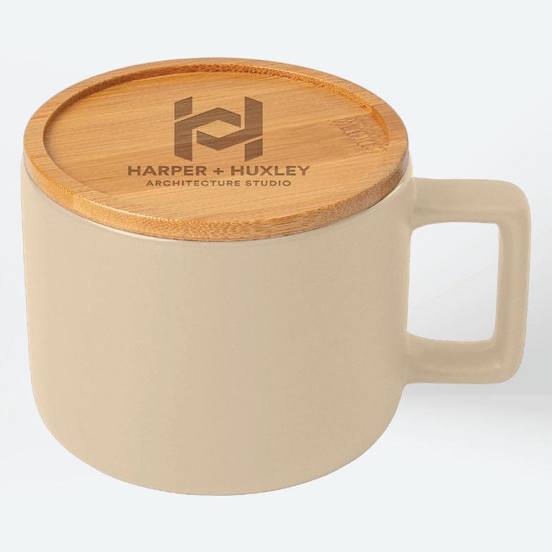 12oz. Ceramic Mug with Bamboo Lid • Deco Methods: Silkscreen (on mug only), 3"w x 1"h | Laser Engraved (on lid only) 2"w x 2"h • MOQ: 36 • Production: As quickly as 5 days