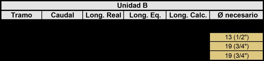Según tabla, para un caudal de 0,792 lts/s ≈ 0,81 lts/s y 10 m.c.a., corresponde un diámetro de 0,019 m (3/4").