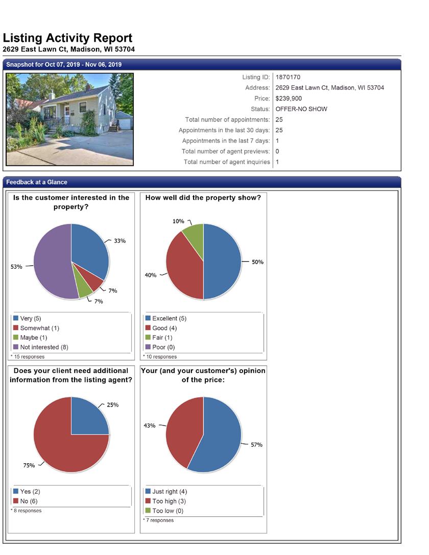 This is an example of the Activity and Feedback Report. Upon your first showing, you will receive a link that allows you to view each showing and their feedback of your property.